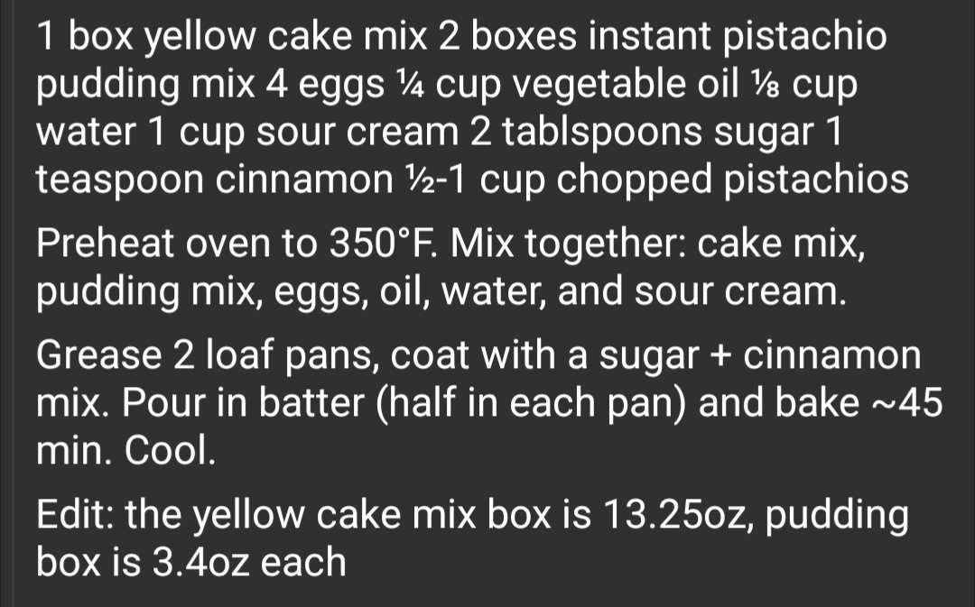 - Mix together: cake mix, pudding mix, eggs, oil, water, and sour cream.