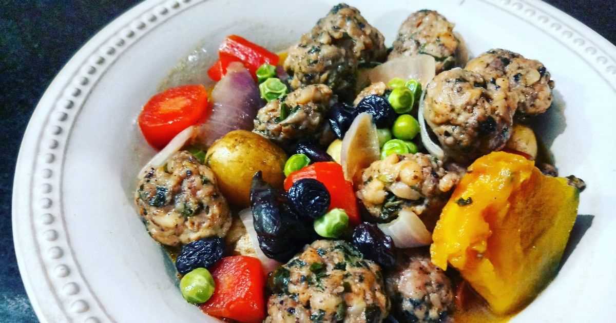 - Add Almonds, Raisins, Prune, water, milk, pepper, salt and the oozed chicken meatball's water and seer it on low flame with cover for 12-15 minutes till the vegetables gets soft and the water reduces to half.