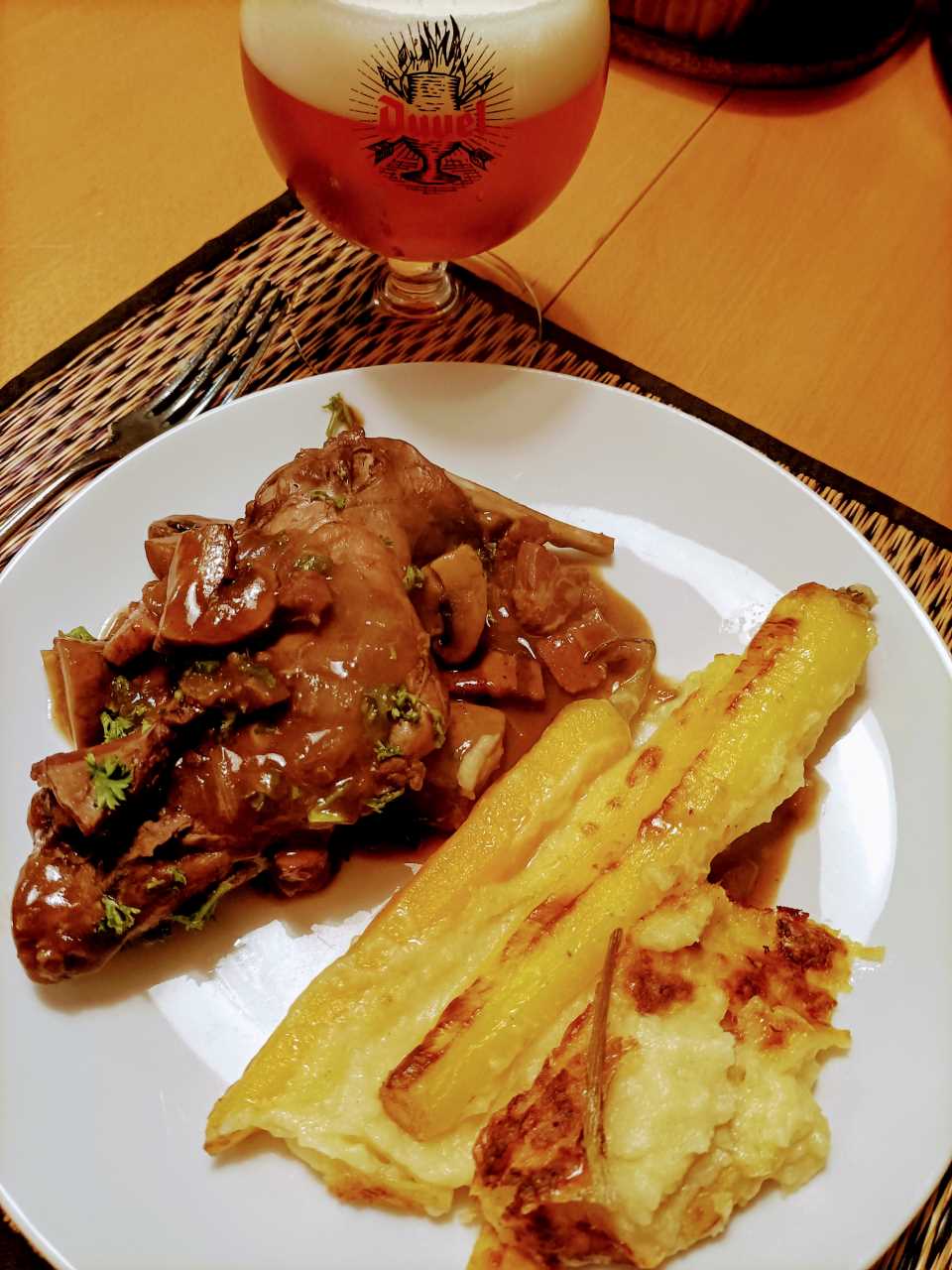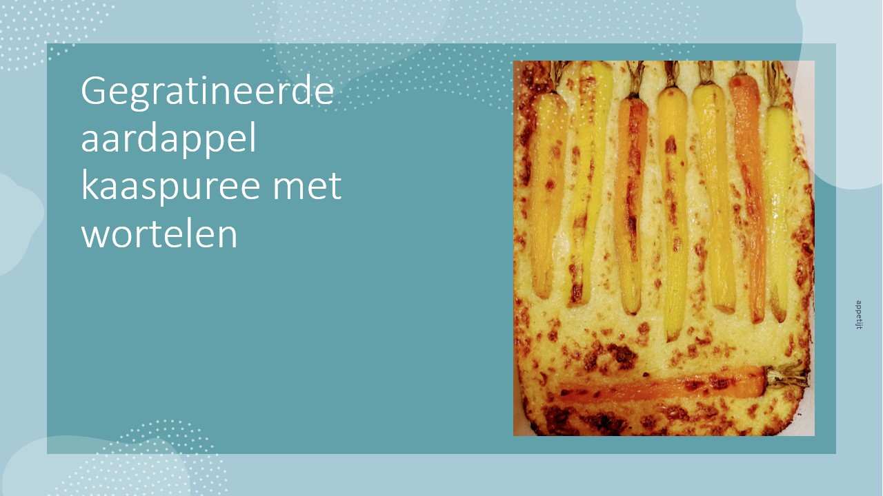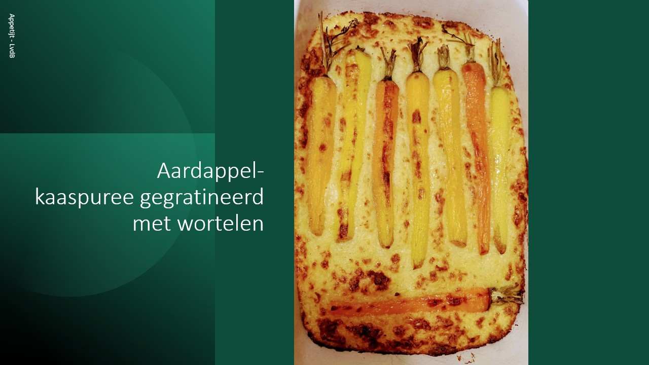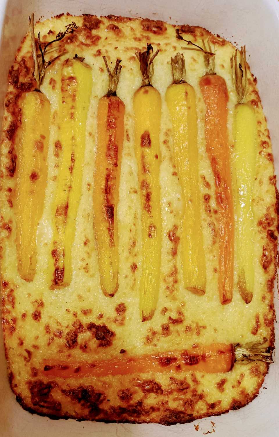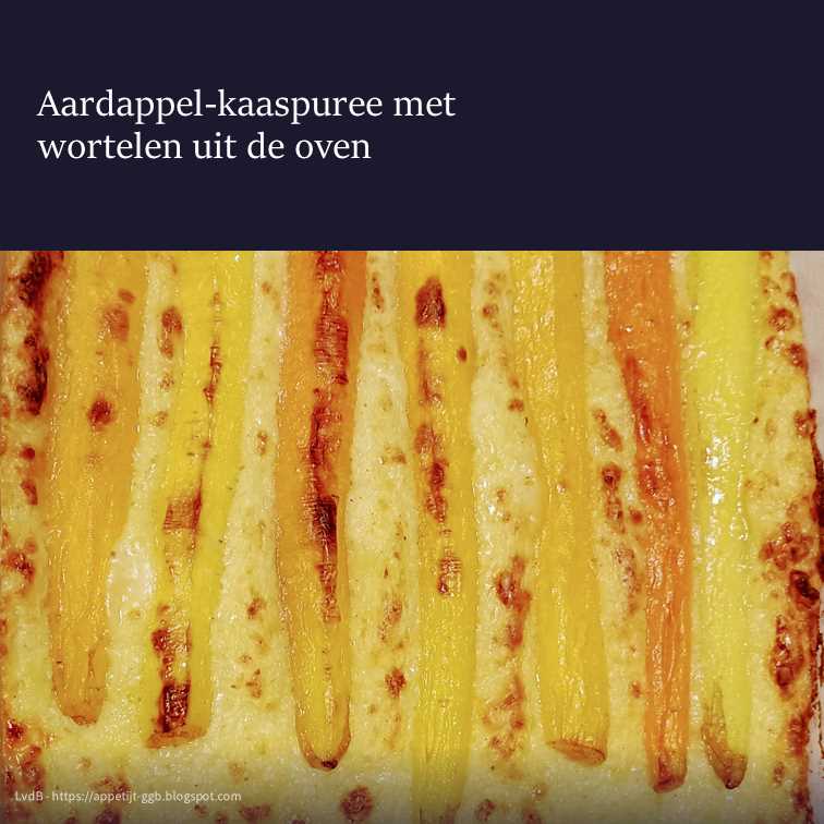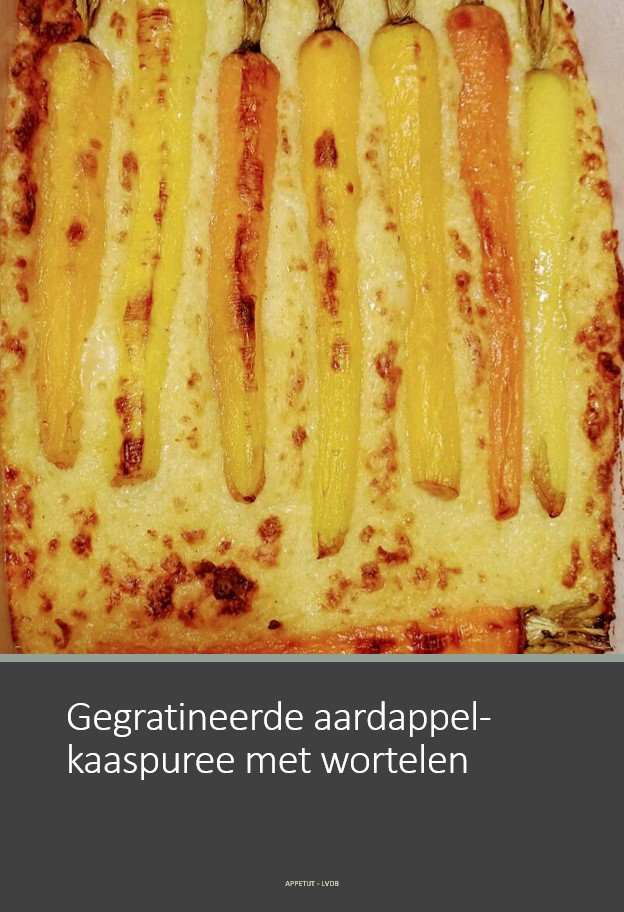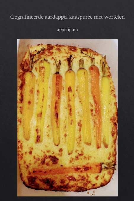 - Doe de aardappelkaaspuree in een ingeboterde ovenschaal, strijk glad en schik er de gestoomde wortelen op.