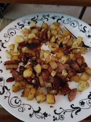 - This can also be made in a skillet! For stovetop start with 1/4 cup water or 2 tablespoons oil. vegetables, cover and cook checking often once they are tender add the smoked sausage, and once they are close to done top with cheese if you like.