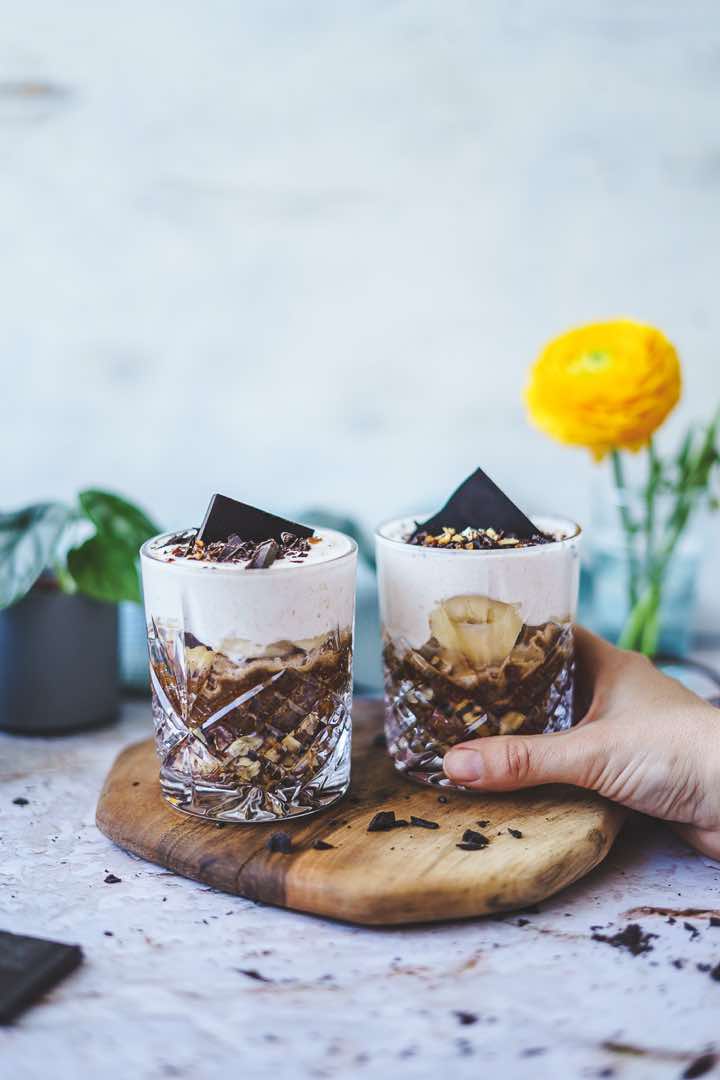 - 6. Die Nussmischung auf zwei Dessertgläser aufteilen. Eine Schicht Dattelcreme darauf verteilen. Diese dann mit den Bananenscheiben belegen und den Joghurt darauf geben. Die Schokoraspeln darauf verteilen und servieren!