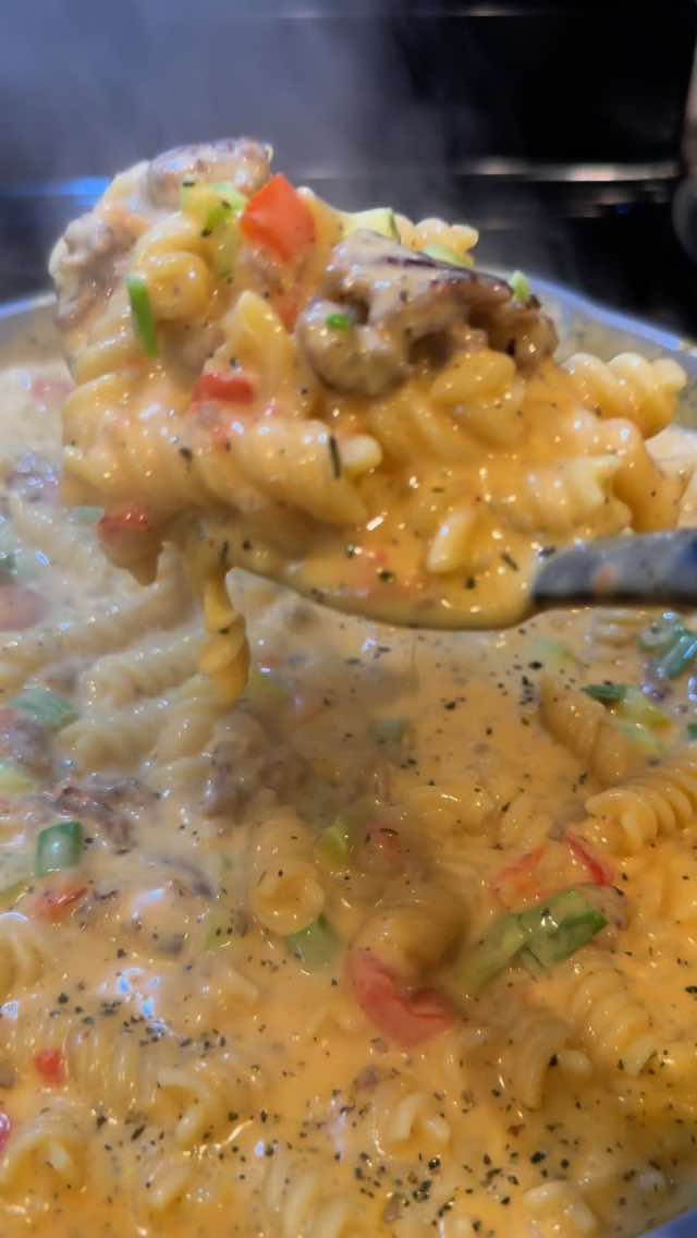 - 3. Add in cheese, cheese soup and heavy whipping cream and let simmer.
