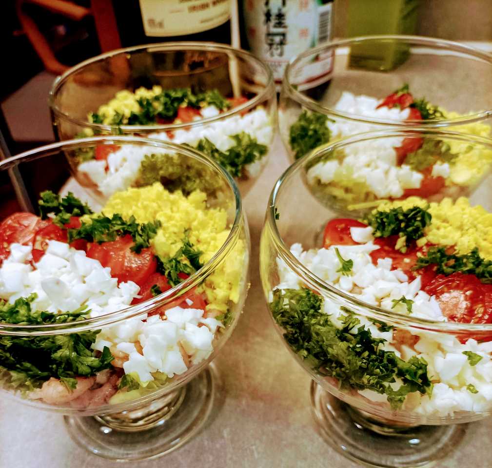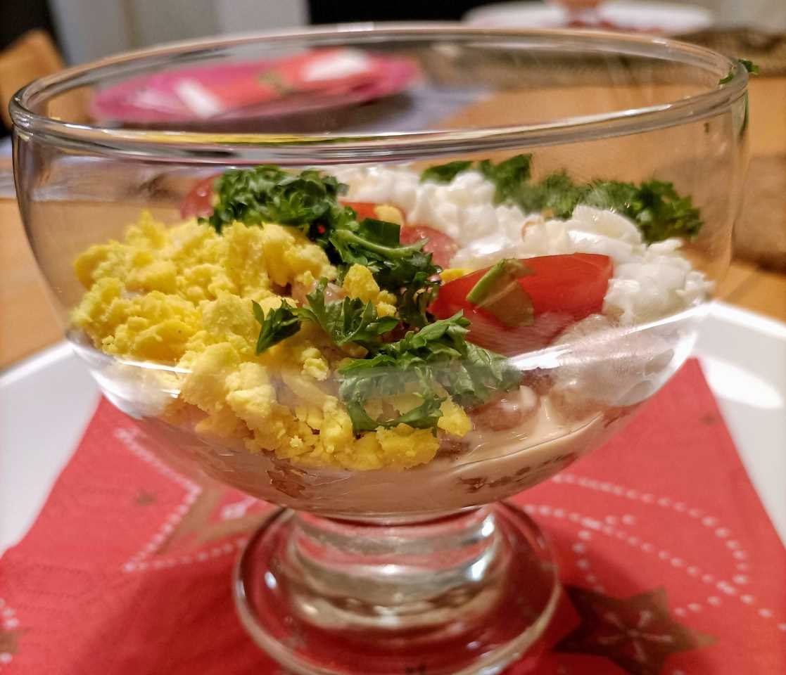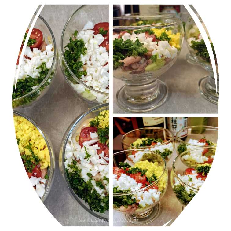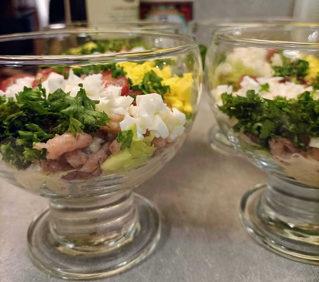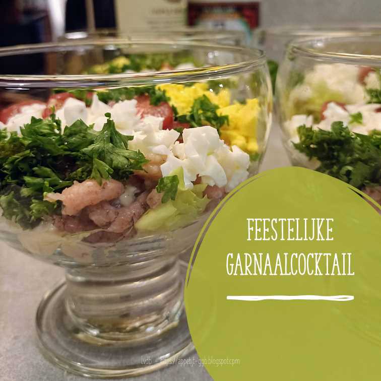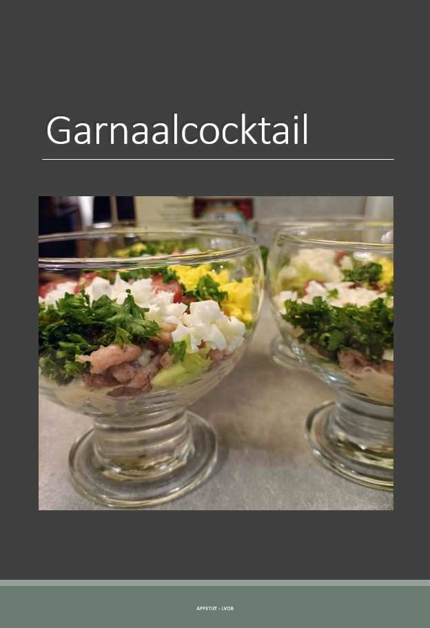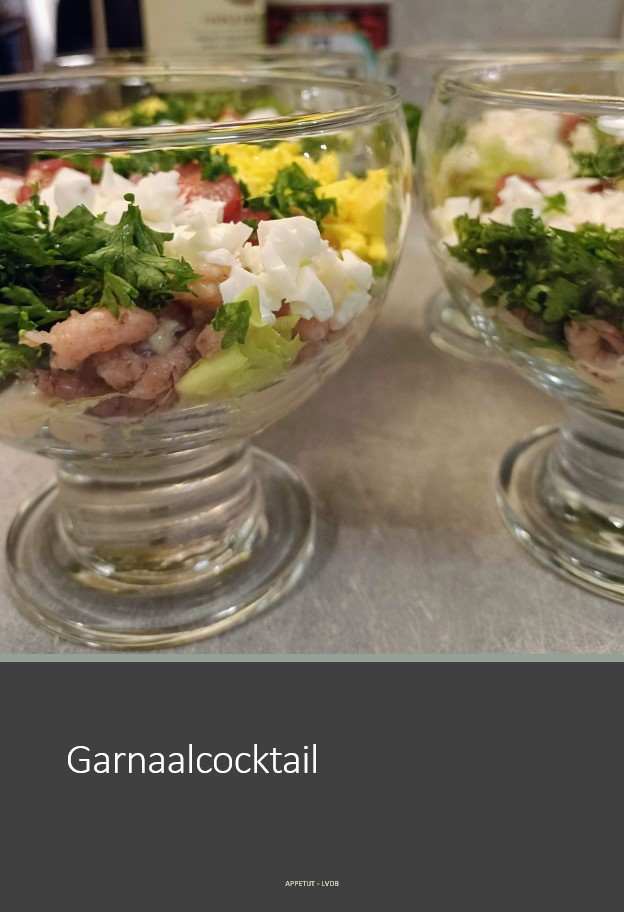 - De garnaalcocktail afwerken met tomatenblokjes, fijngehakt ei en peterselie.