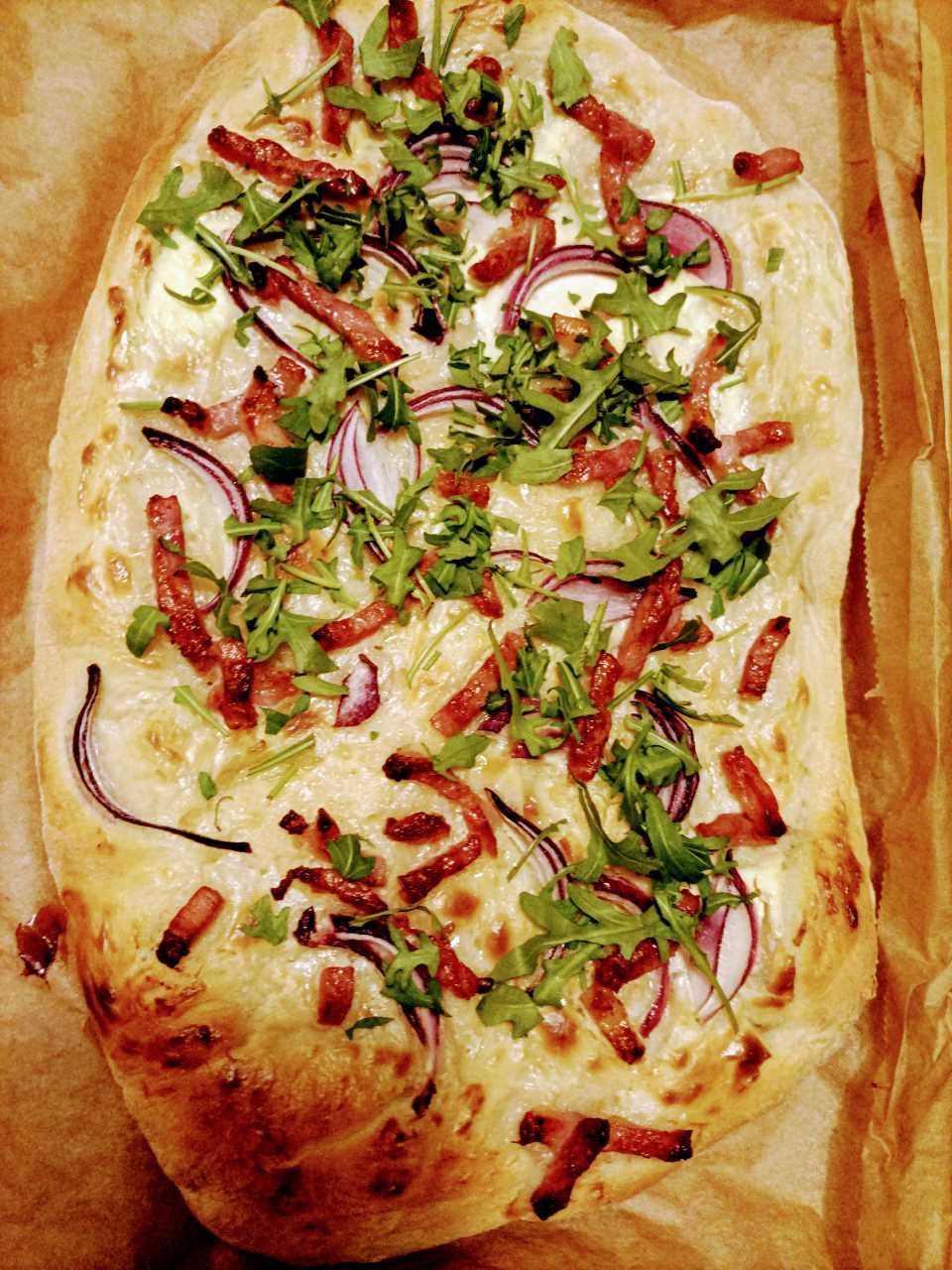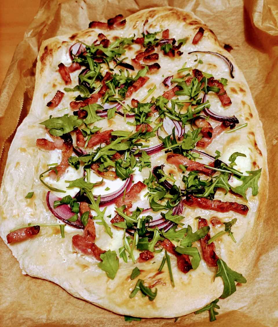 - Intussen heb je rucola gewassen en een beetje klein gesneden om bij het opdienen over de flammkuchen te verdelen.