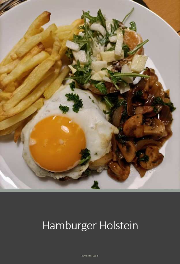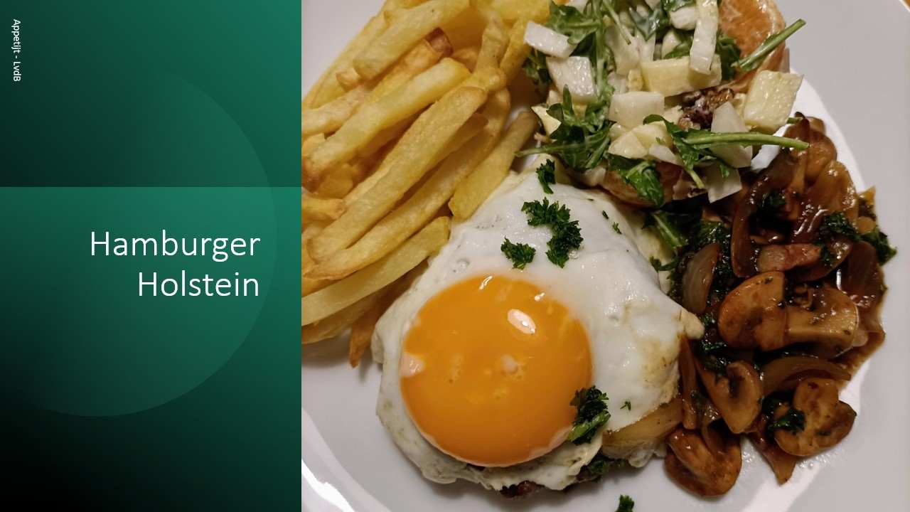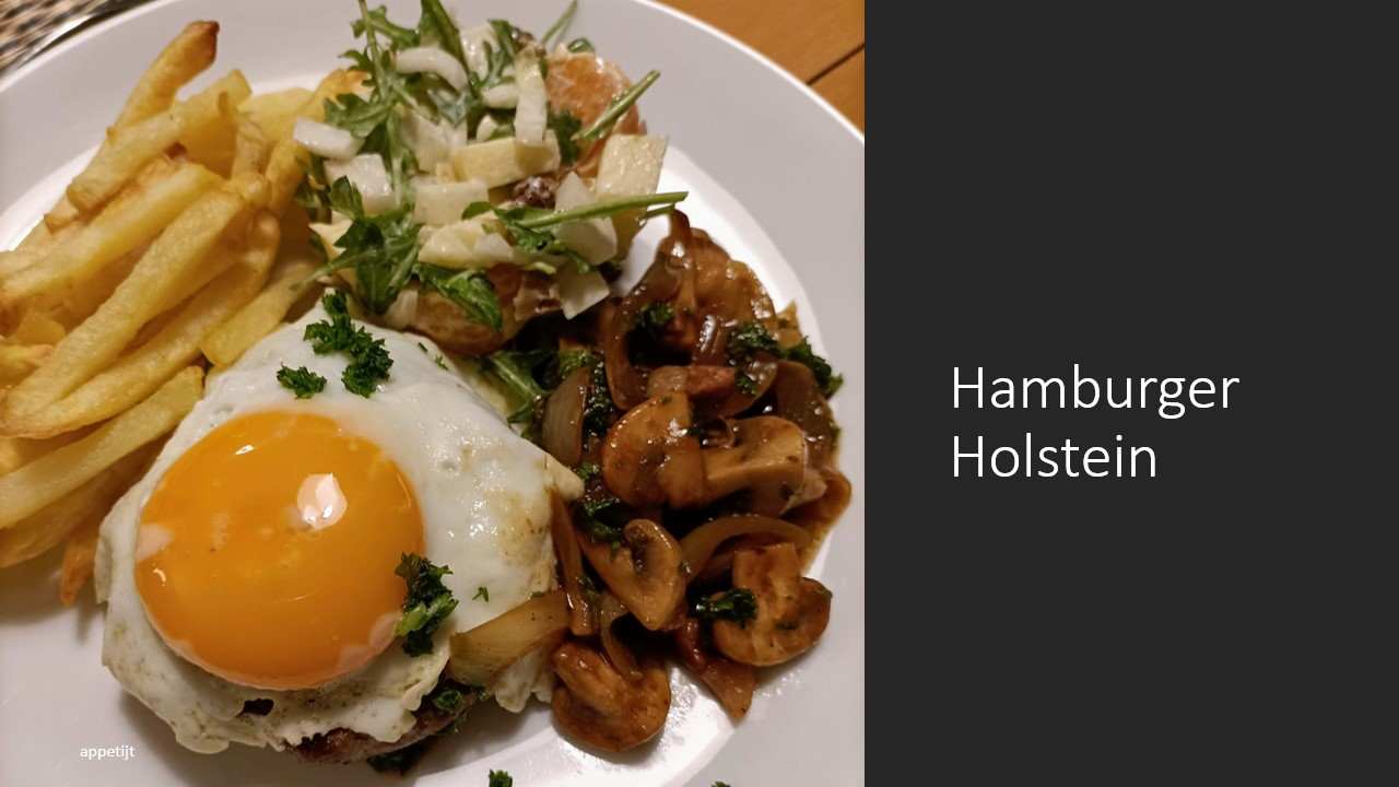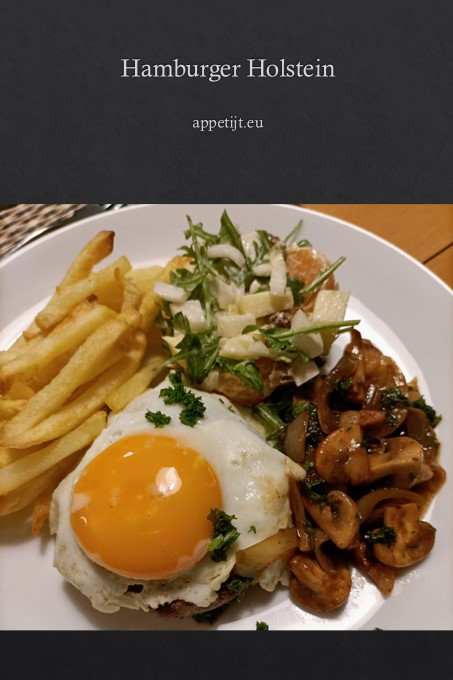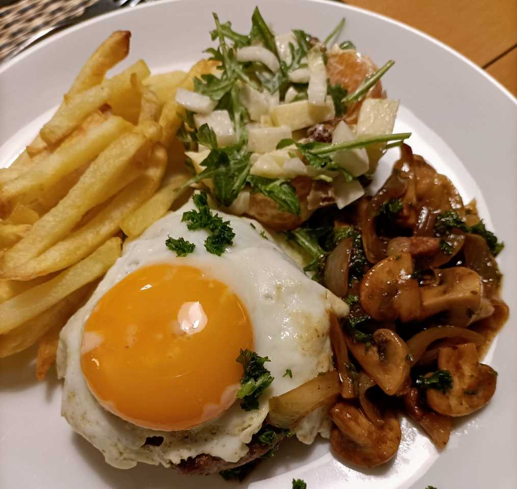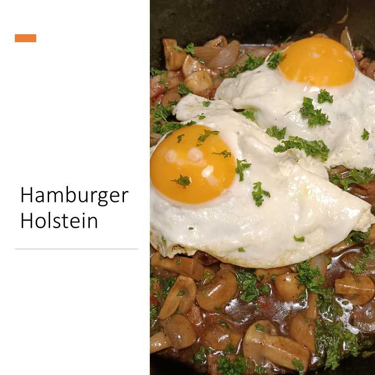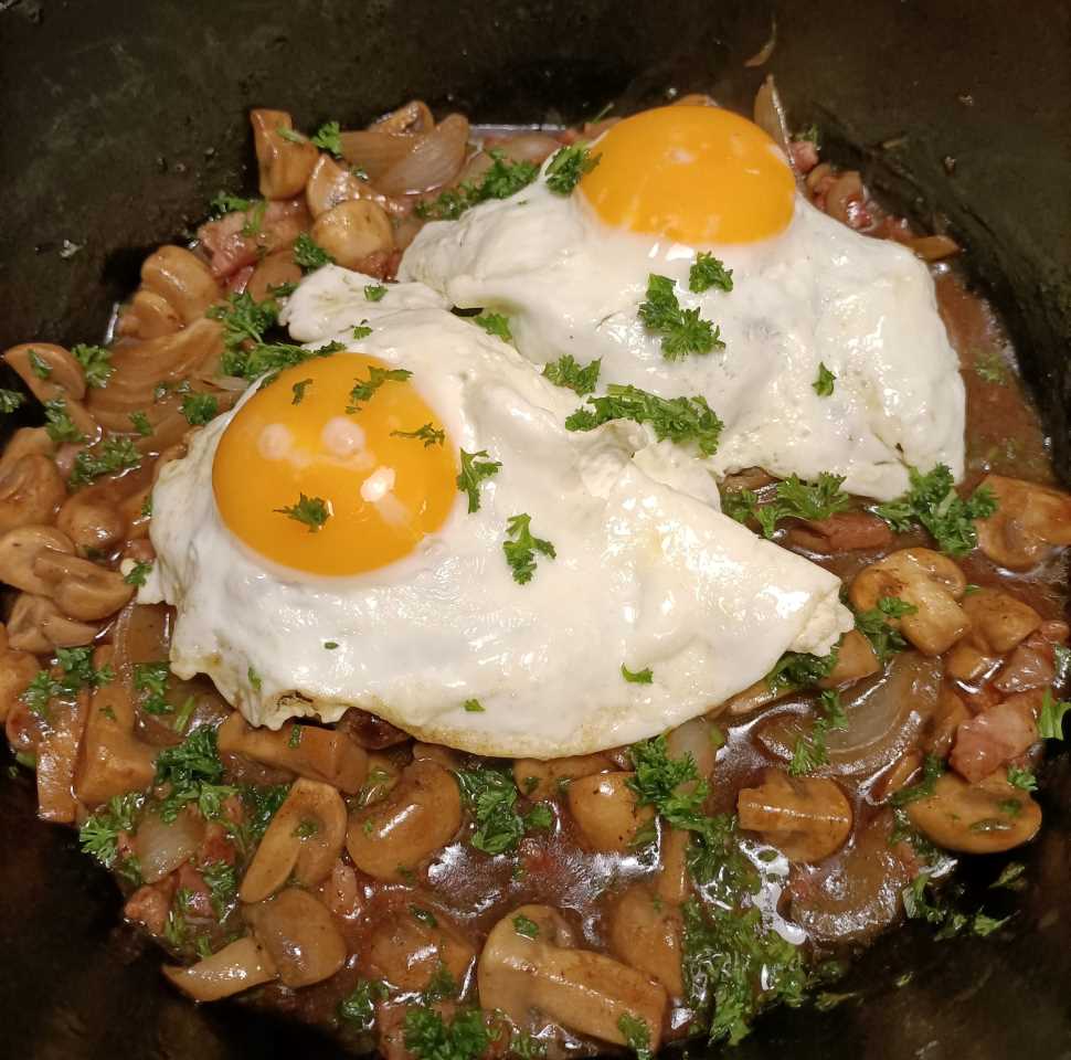 - Leg de spiegeleieren op de hamburgers en werk alles af met gehakte peterselie.