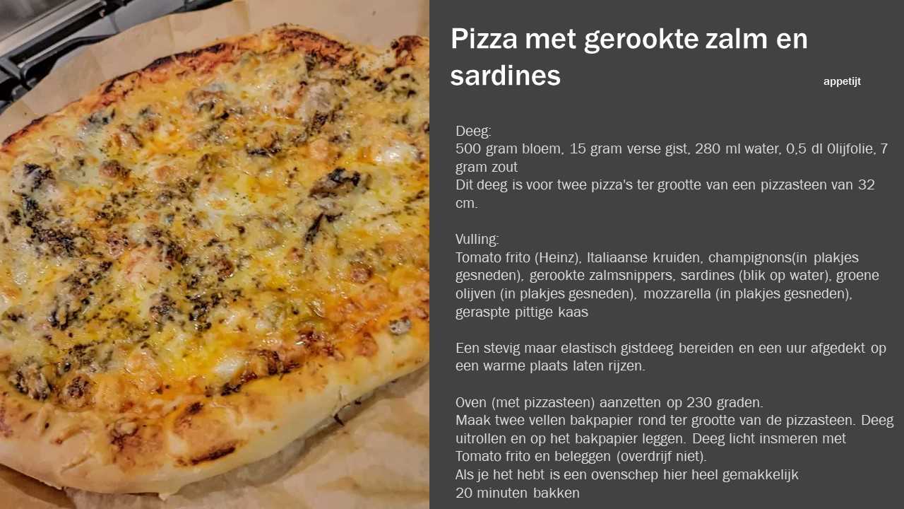 - Tomato frito (Heinz), Italiaanse kruiden, champignons(in plakjes gesneden), gerookte zalmsnippers, sardines (blik op water), groene olijven (in plakjes gesneden), mozzarella (in plakjes gesneden),