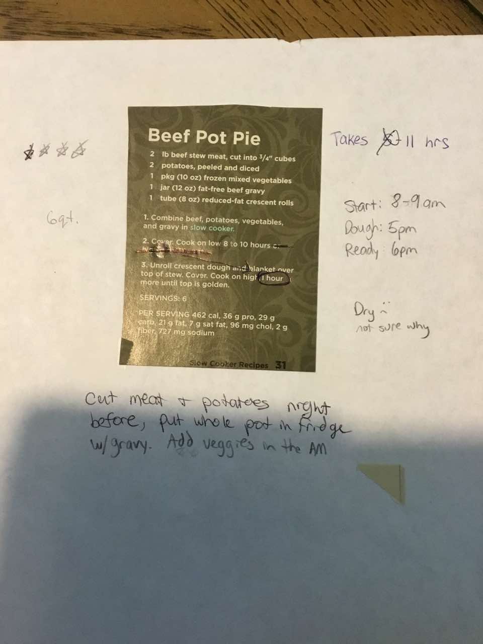 - Optional: cut meat and potatoes night before, put whole pot in fridge with gravy. Add veggies in the morning