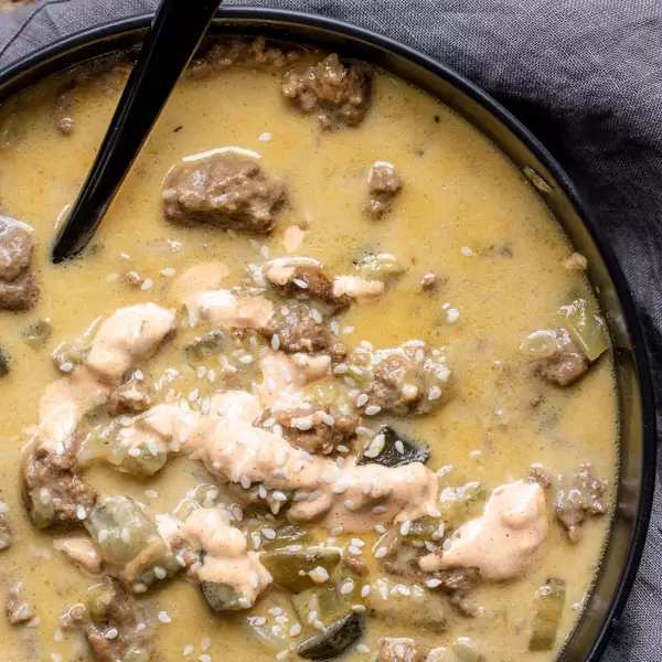 - 7. Once cheese has melted serve soup with a garnish of sesame seeds and a drizzle of special sauce.