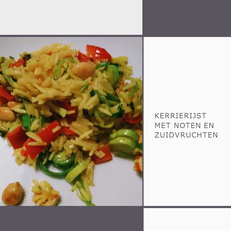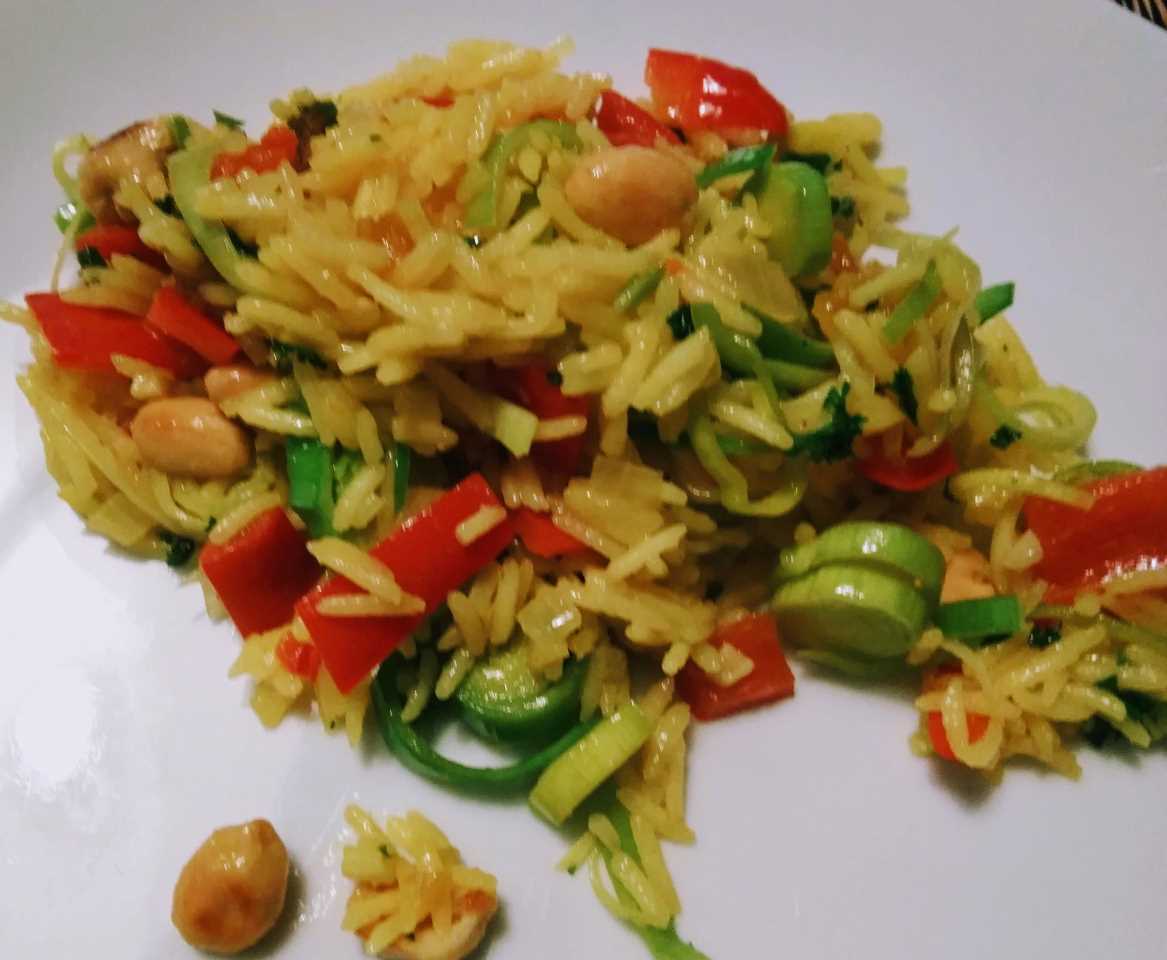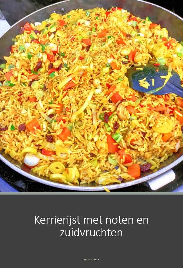 - Naar het einde van de bereidingstijd de groenten, noten, rozijnen en abrikozen door de rijst roeren.