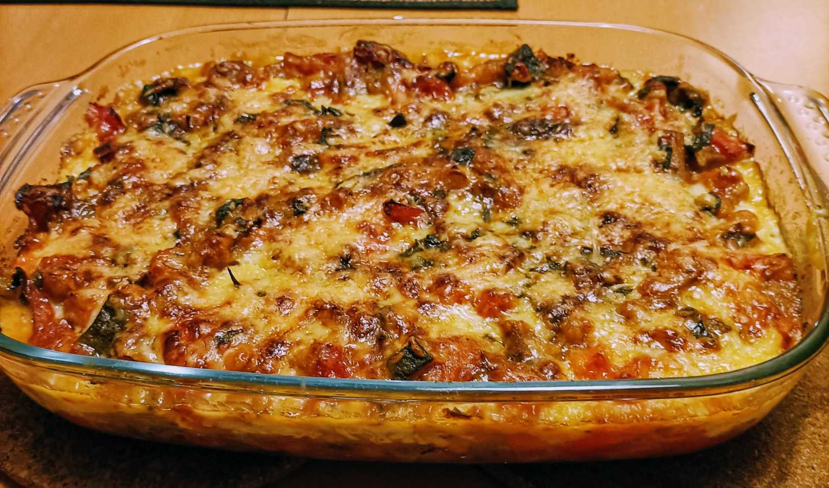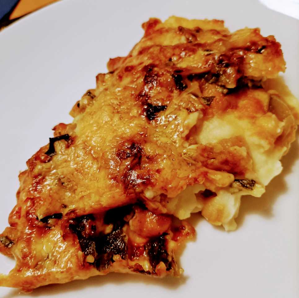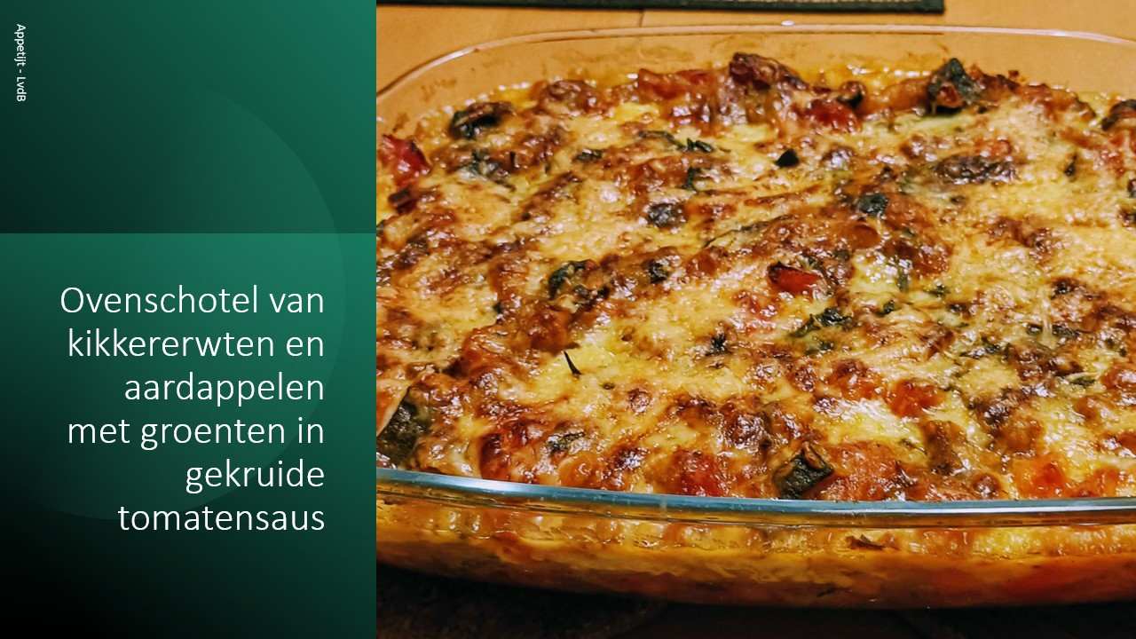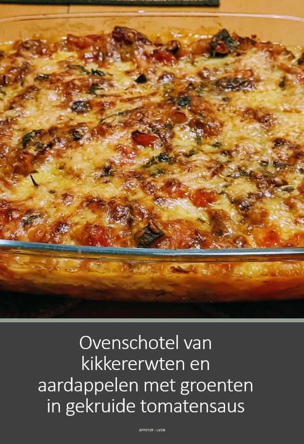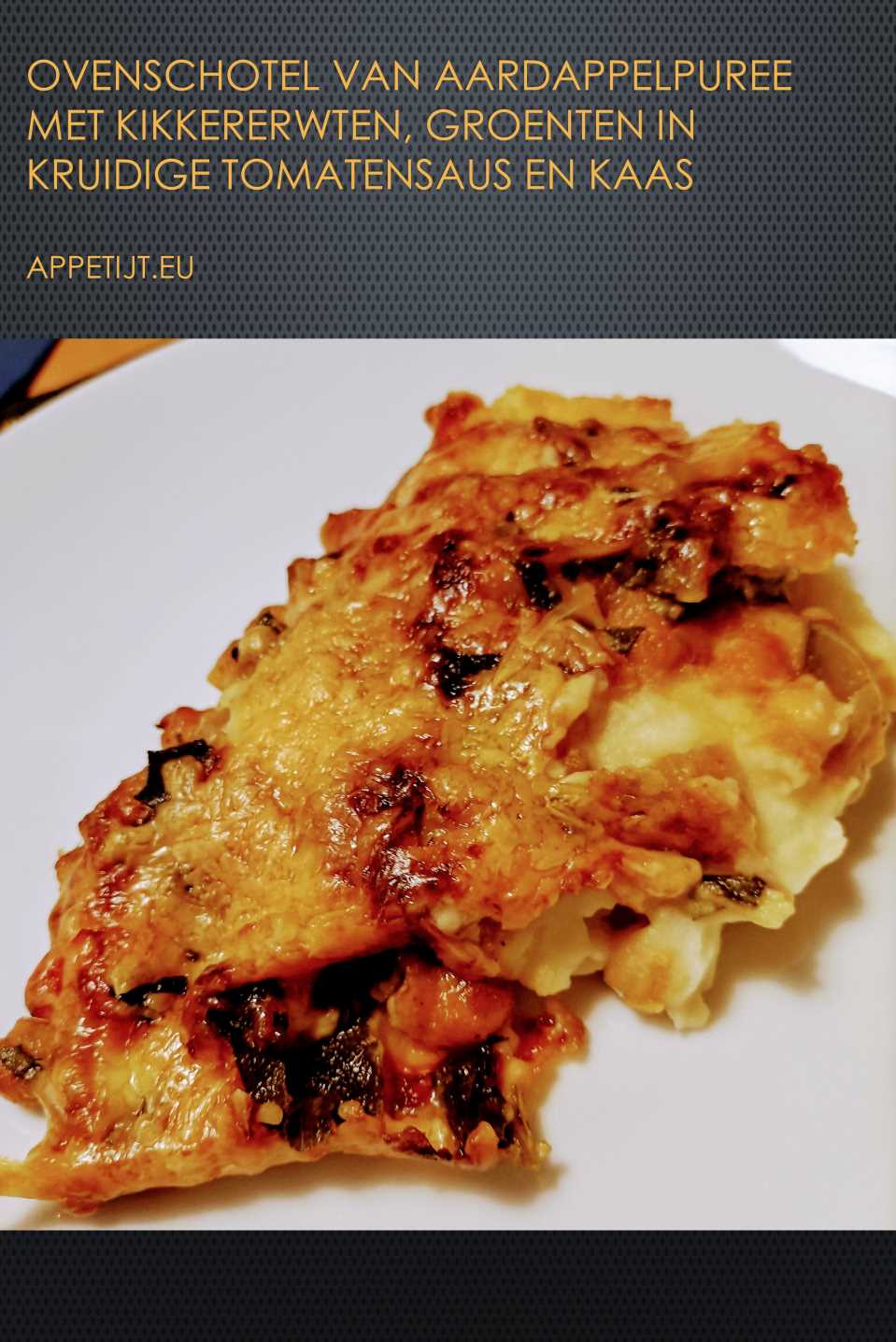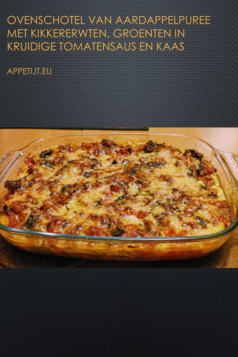 Ovenschotel van aardappelpuree met kikkererwten, groenten in kruidige tomatensaus en kaas