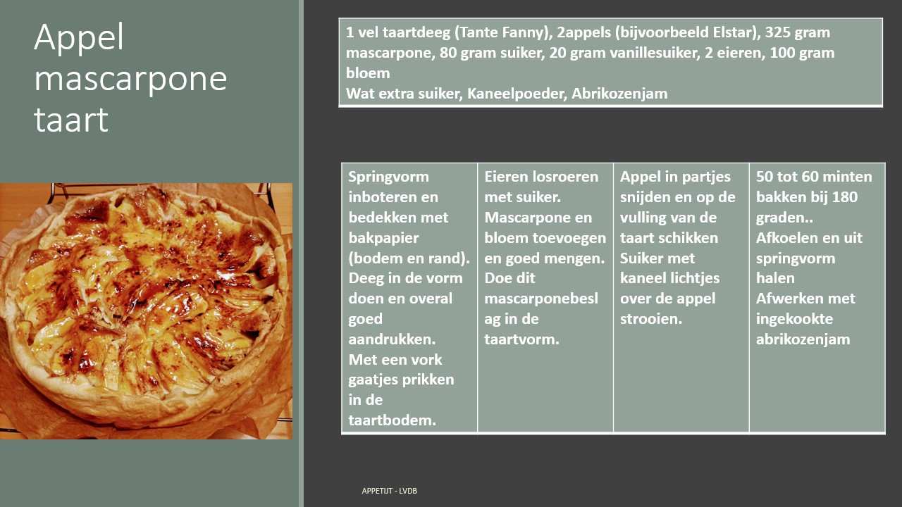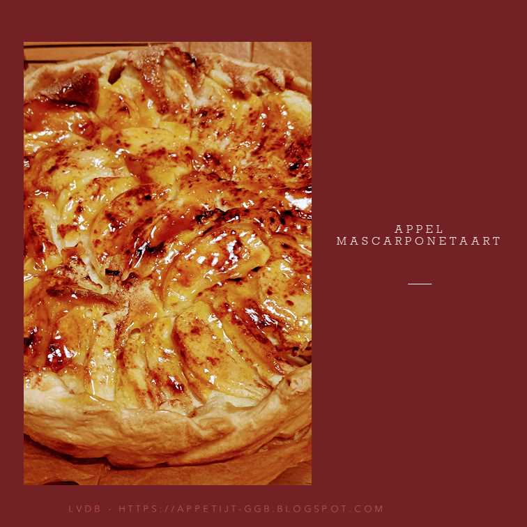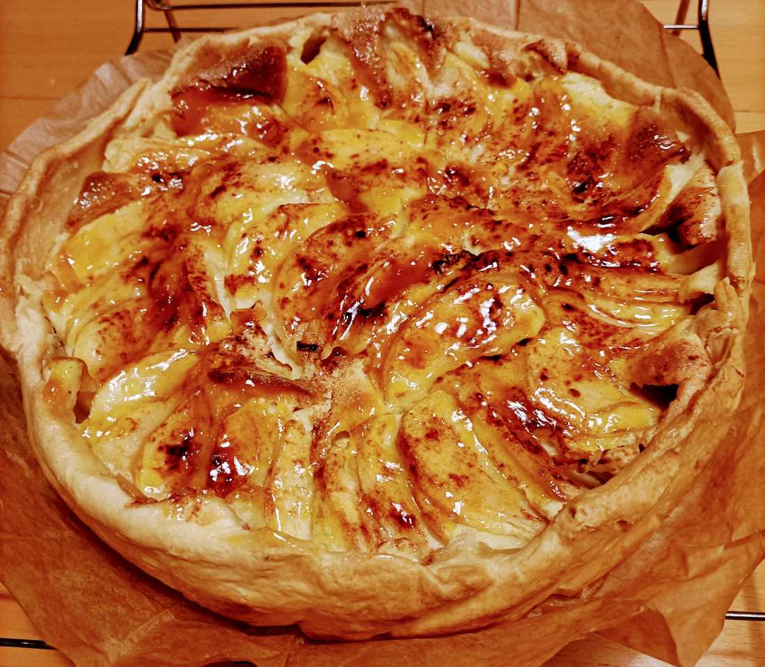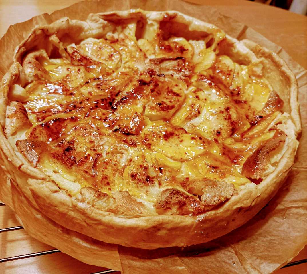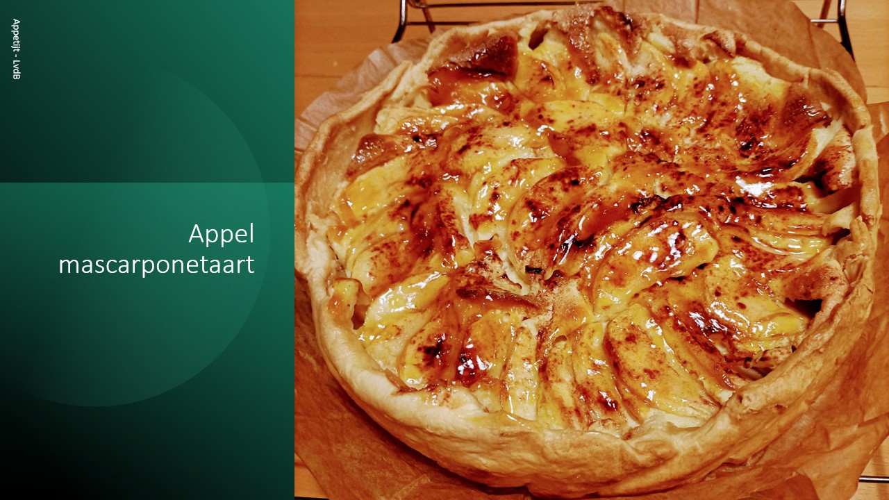 - De kwarten appel in plakjes snijden en dakpansgewijs op de vulling van de taart schikken en iets in de vulling duwen.