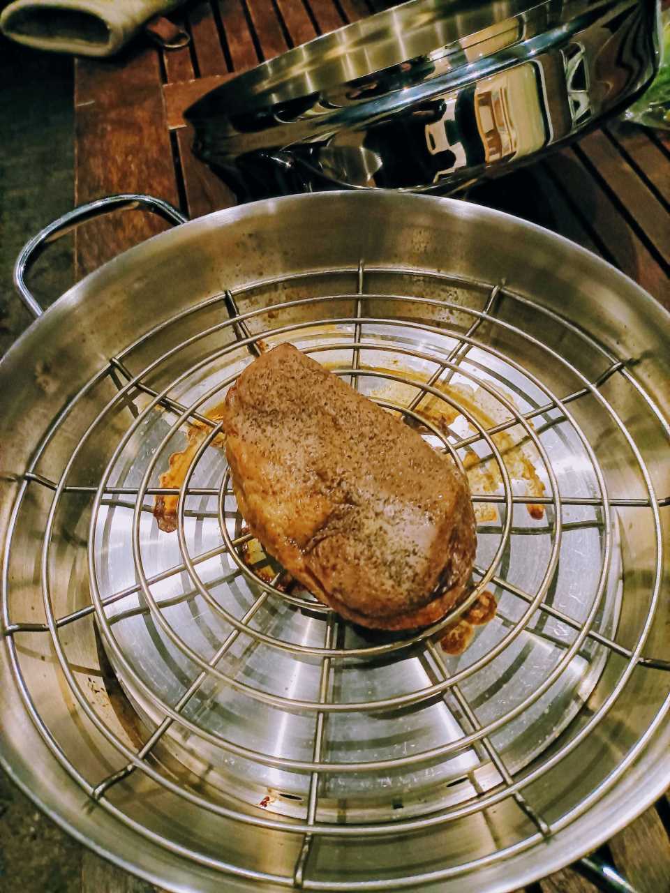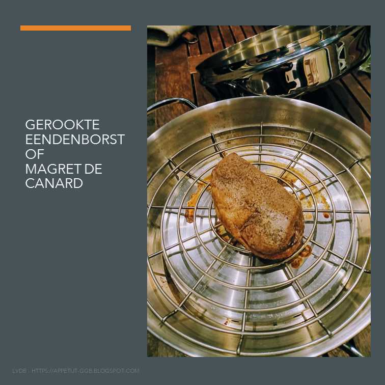 - Bij het oplichten van het deksel merk je of er al voldoende rook gevormd is en leg je de eendenfilet met de vetzijde naar onder op het rooster van de rookpan.