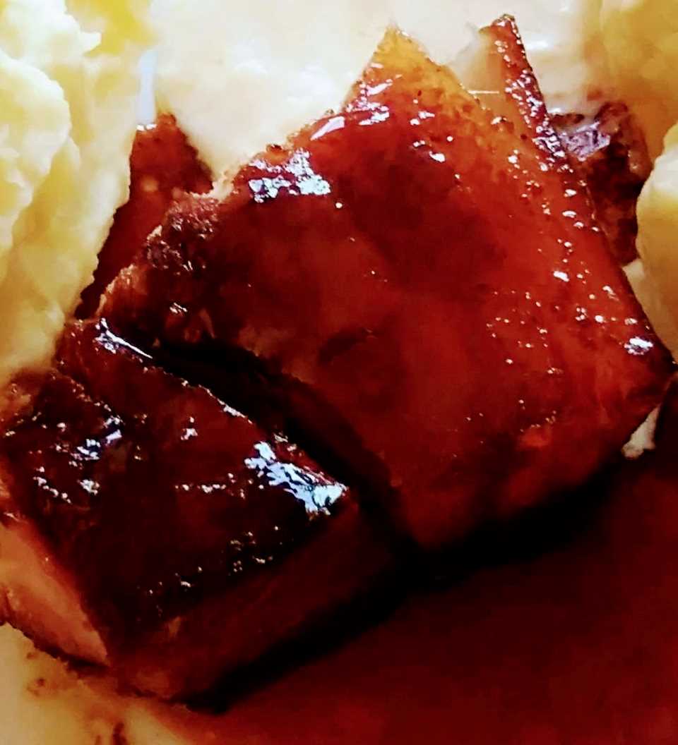 - Het spek uit de vacuümzak halen, het vrijgekomen vocht bij de stroop doen en dit opnieuw laten inkoken tot een dunne stroop.