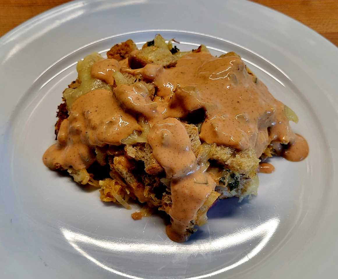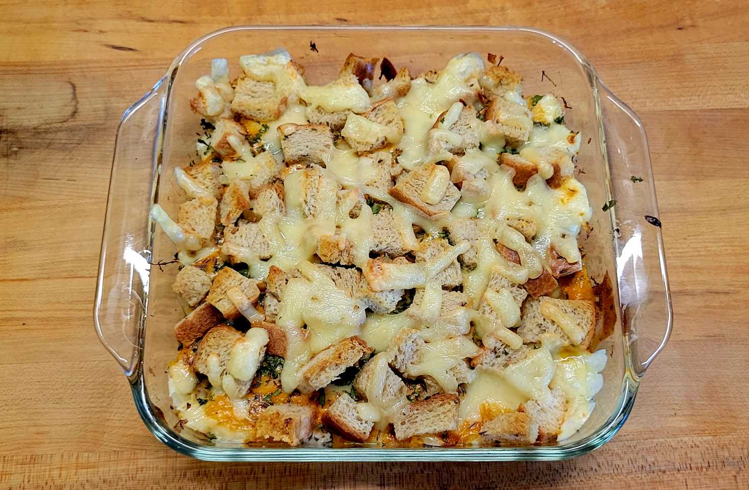 - Bake for 30-35 minutes, or until the cheese is melted and bubbly, and the bread cubes are golden brown on top. Let cool slightly before serving.