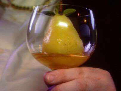 - 2. Core the pears from the bottom. Decrease the heat to medium low and place the pears into the liquid, cover and cook for 30 minutes or until the pears are tender but not falling apart. Maintain a gentle simmer. Remove the pears to a serving dish, standing them upright, and place in the refrigerator.