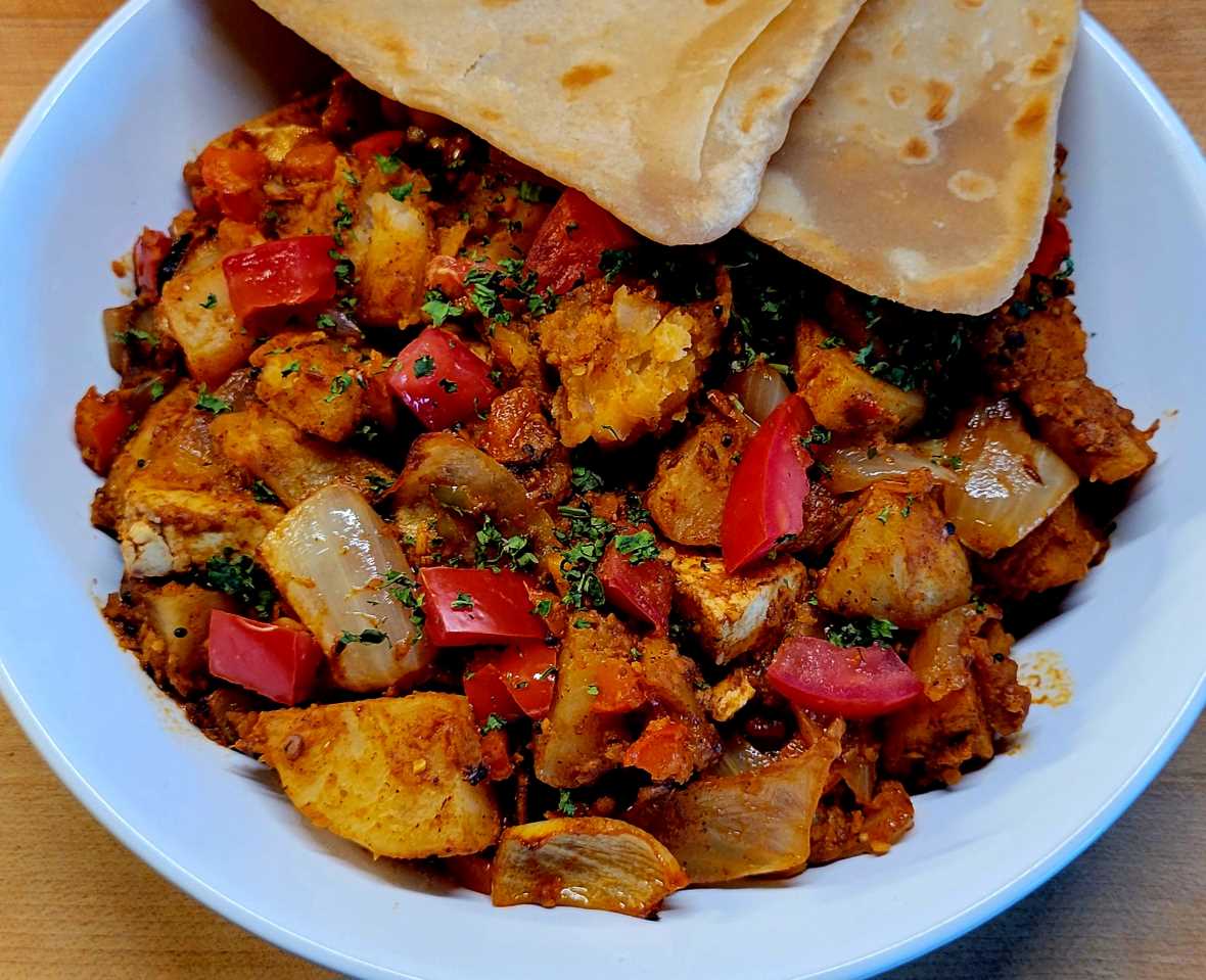 - Chop the potatoes, onions, and tempeh into tiny, bite-sized pieces. Put them together in a bowl with the curry powder, vegetable oil, and optional red chili flakes. Spread it evenly on a baking sheet after tossing to coat well. The potatoes should be cooked through and have golden edges after roasting in the oven. About half an hour, with a half-way turn.