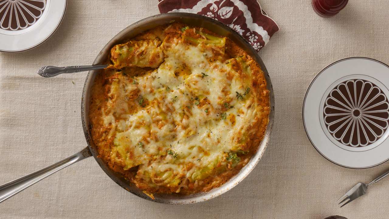 - 4. Working one at a time, spoon 1 heaping Tbsp. reserved ricotta mixture onto each noodle and spread evenly from end to end. Tightly roll up noodles. Arrange lasagna rolls, seam side down, in skillet, starting from the center and working in a circle toward edges to create a spiral. Top with reserved sauce; scatter 4 oz. low-moisture mozzarella, coarsely grated (about 1 cup), over. Bake until cheese is deep golden brown, 33–38 minutes. Let lasagna cool slightly. Top with thyme leaves and season with more pepper to serve.