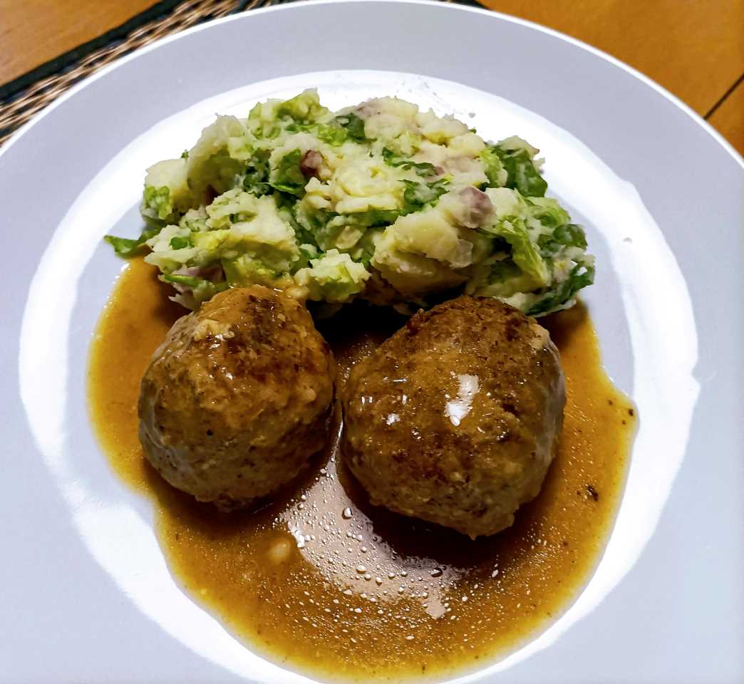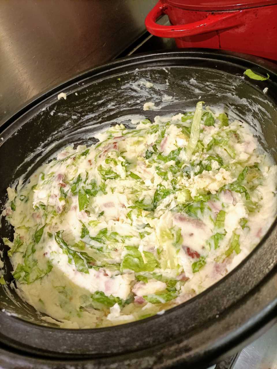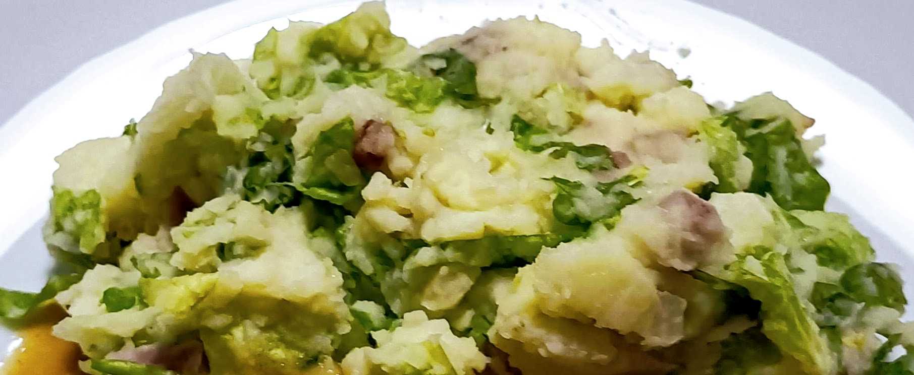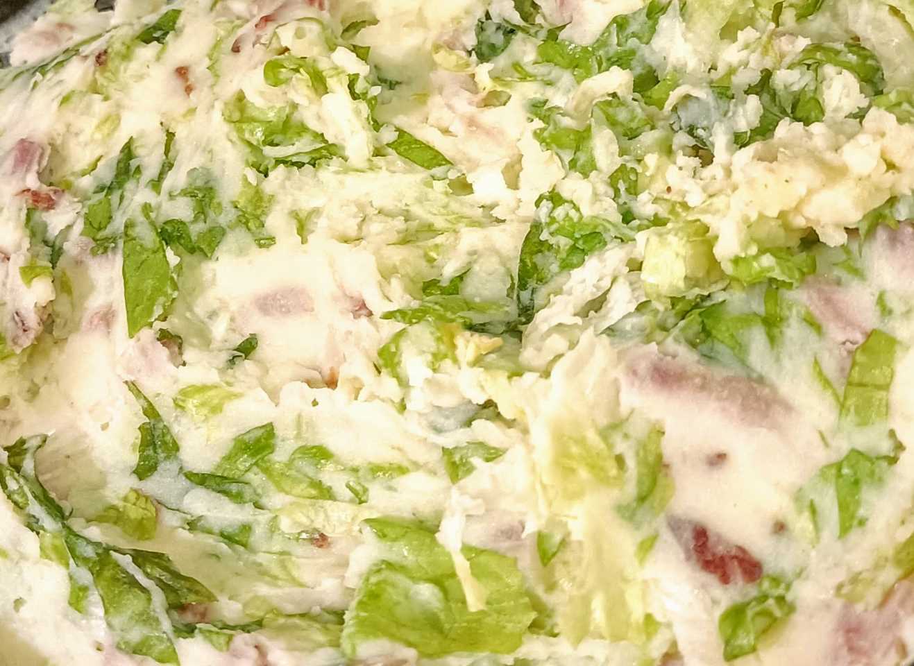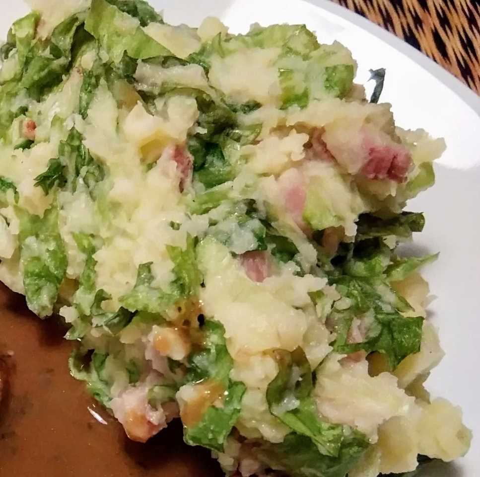 - Andijvie en gebakken spekblokjes goed mengen met de aardappelpuree en op smaak brengen.
