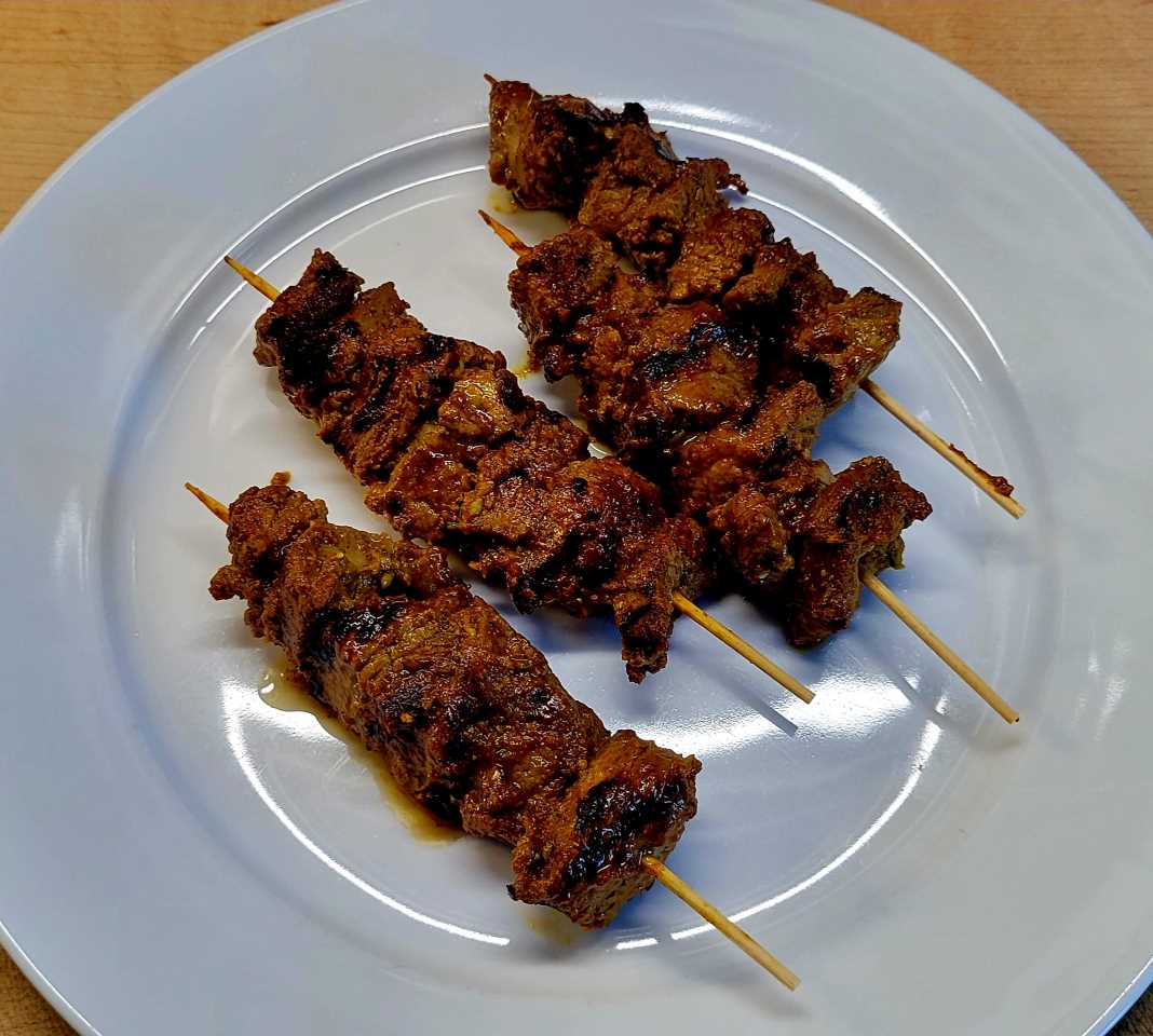 - Skewer the meat, and roast over a hot charcoal grill or under an oven broiler until slightly charred and tender. You can brush a bit of oil during the cooking process so that the meat doesn’t dry out. Keep turning the skewers as you grill to ensure the meat is cooked evenly. Be careful not to overcook, as this will dry and toughen the meat.