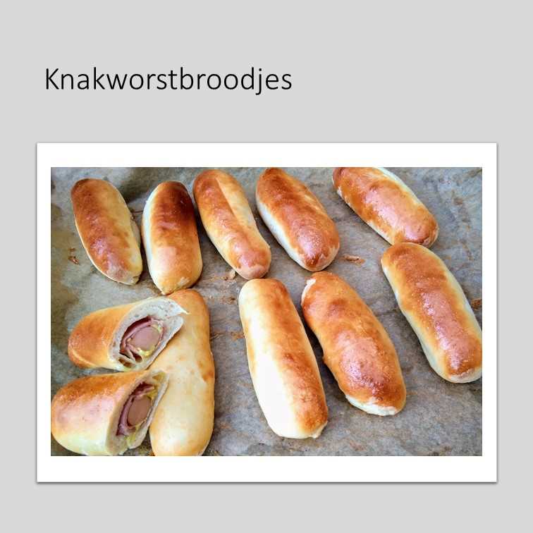 - Intussen de knakworsten goed laten uitlekken en de ham in 24 gelijkmatige plakjes verdelen.