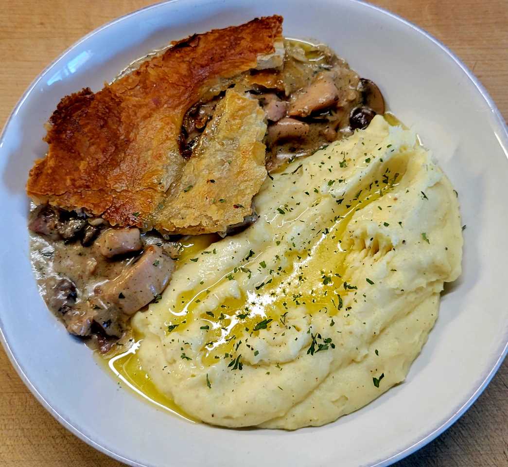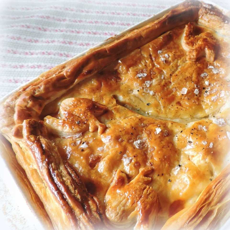 - One of Britain's favourite pies! Tender pieces of chicken with mushrooms in a delicious gravy beneath a puff pastry hat.