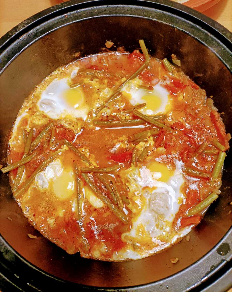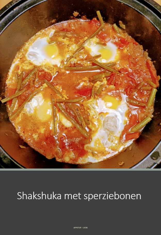 - Breek de eieren in de kuiltjes en laat onder deksel verder smoren tot het eiwit gestold is.