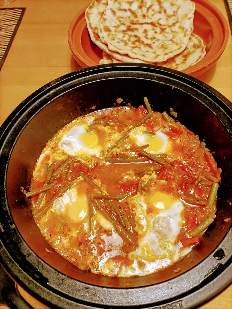 - Maak zoveel kuiltjes in het stoofgerecht als je eieren hebt.