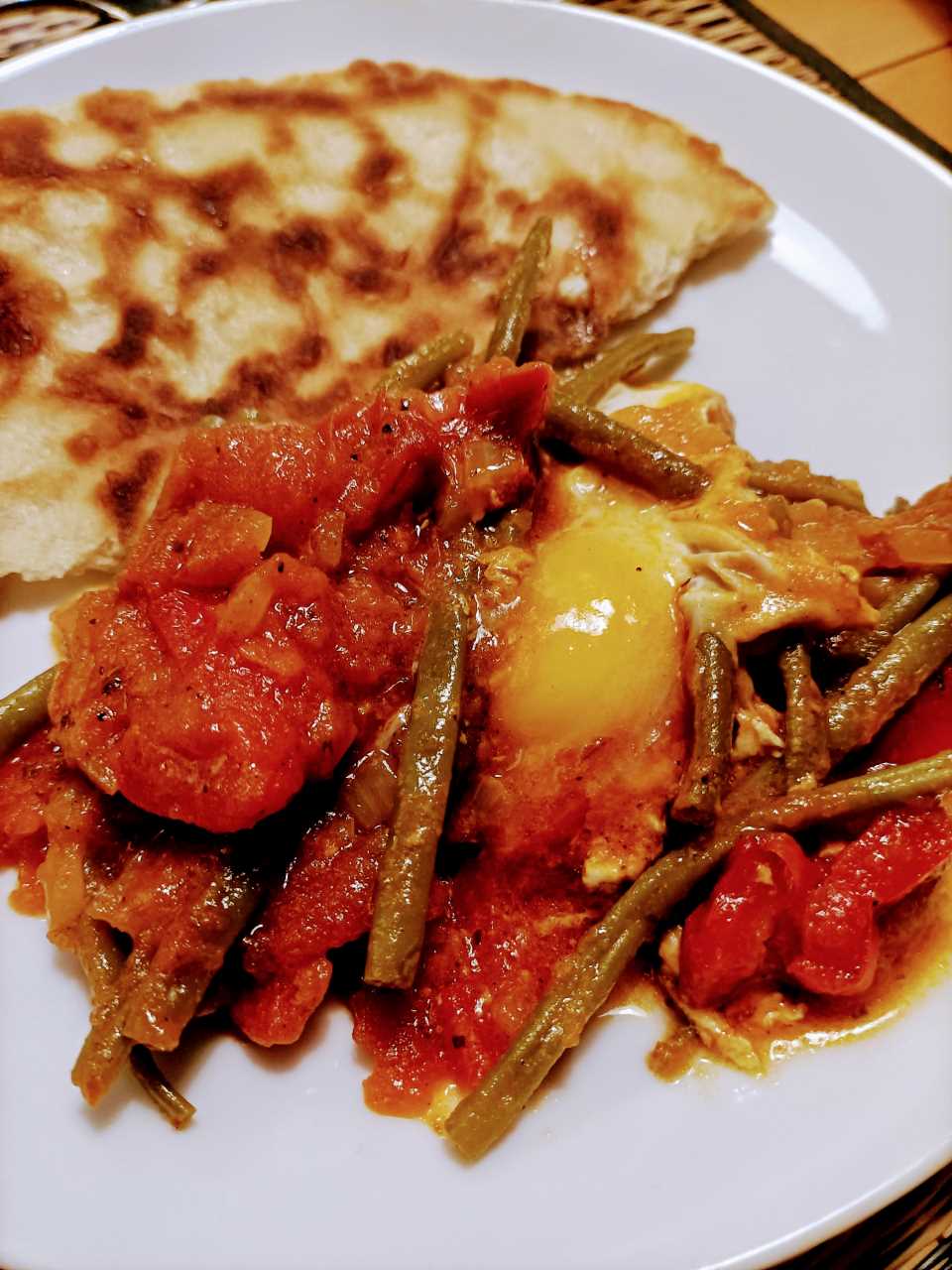 - Voeg na 10 minuten, als de tomaten "gesmolten" zijn een klein beetje tomato frito, sperziebonen en paprika toe.