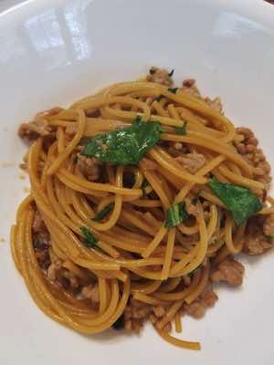 - I add one third of the sauce to the meat in the pan, tossed 1/3 sauce with the pasta and then add the remainder to the skillet with the meat and wilted spinach, when I add the pasta. Toss to coat, and serve!