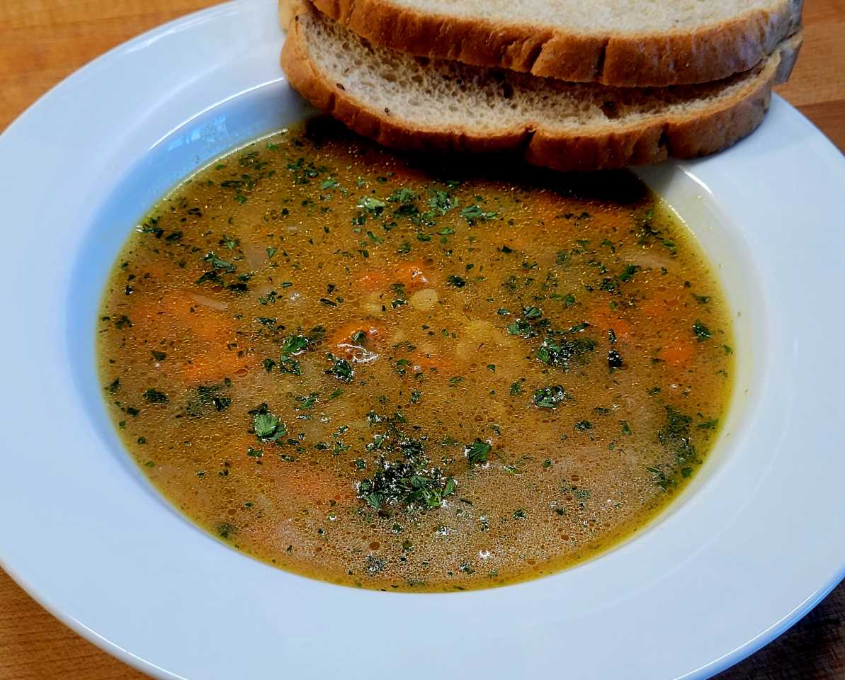 - Transfer 1 cup of the soup solids to food processor. Add remaining 3/4 cup water and process until smooth. Return purée to pan and stir in half the parsley or dill, if using. Simmer, stirring often, for 5 minutes to blend the flavors, thinning soup with water if too thick. Serve sprinkled with the remaining parsley or dill.