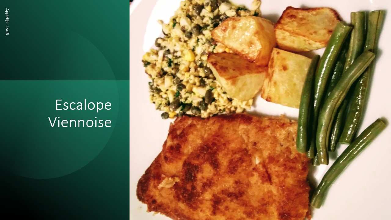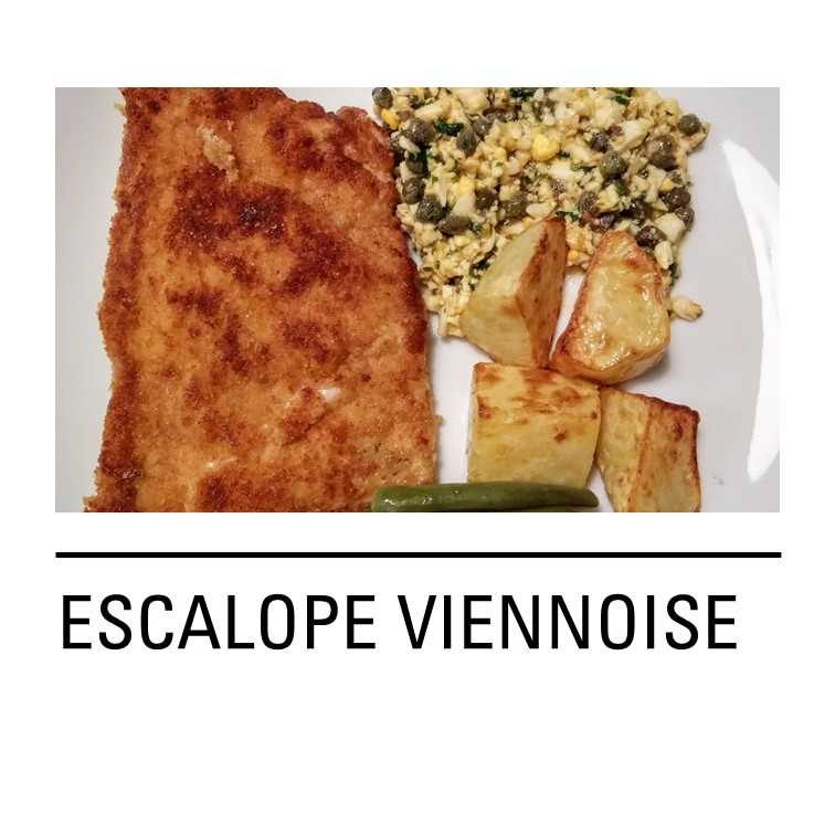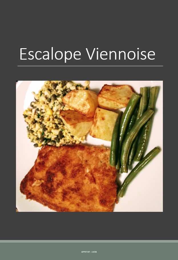 - In de tijd voor de Nouvelle Cuisine (tot de eerste helft van de jaren 70 van de vorige eeuw) werd dit gerecht opgediend op dienschalen waarop het gebakken gepaneerde vlees lag met op ieder stuk een plakje citroen, een plakje olijf en een opgerolde zoute ansjovis. Aan beide uiteinden van de schaal werd een V gevormd (V van Vienne) met kappertjes, fijn gehakt hard gekookt eiwit, fijn gehakt harde eidooier en gehakte peterselie.