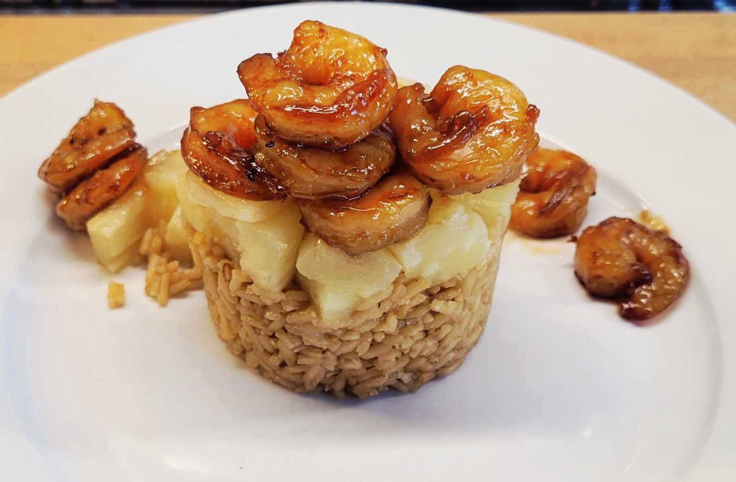 - Arrange cooked rice as the base in a serving dish. Layer grilled shrimp and pineapple chunks on top to create a stacked presentation.