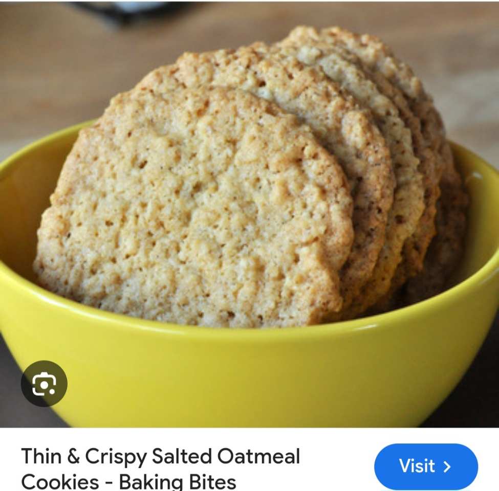 - 350 oven. Whisk flour, powder, soda. Beat the butter and the sugar until light, scrape down and beat in the eggs and vanilla. Slowly beat in the dry ingredients, then stir in the oats. Roll in 1 tablespoon sized balls. Place on lined baking sheets--IT'S IMPORTANT TO USE LIGHT ALUMINUM HERE SO THE BUTTER HAS TIME TO MELT, press down to flatten. Sprinkle lightly with some koshar salt and bake for 13-16 minutes until lightly golden and crisp. Makes 72
