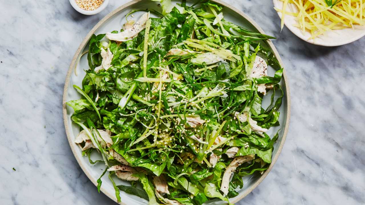 - 6. Transfer salad to a serving bowl or platter and drizzle another tablespoon or so of dressing over salad (you may have some left over). Top with scallions, sesame seeds, and reserved ginger.