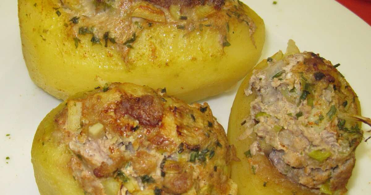 - 2. In der Zwischenzeit aus gewürfeltem Kartoffelinneren gewürfelter Zwiebel Rindergehacktem Ei Salz Pfeffer und Muskat einen Teig herstellen. Die vorgegarten Kartoffeln damit füllen. Das Ganze nun weitere 30 Minuten backen. Guten Appetit!