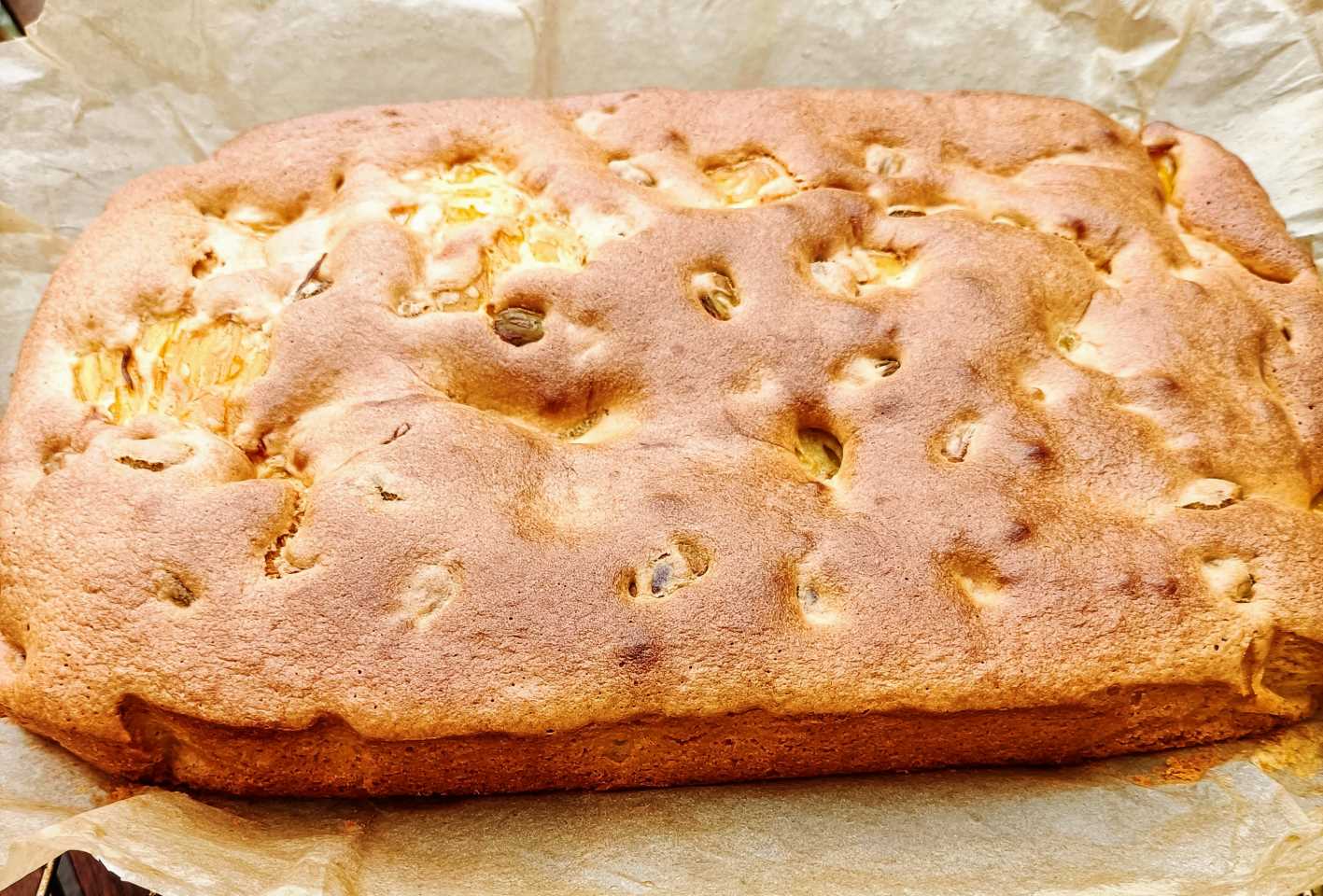 - Jackfruit en pistachenoten verspreiden over het beslag en met behulp van een spatel iets onder het oppervlak duwen.
