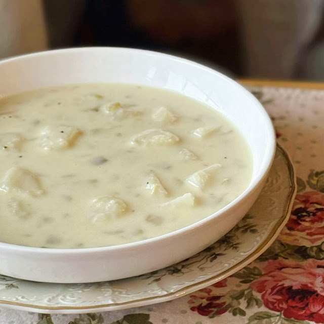 - Whisk in the flour, combining well. Add the potatoes and the broth.