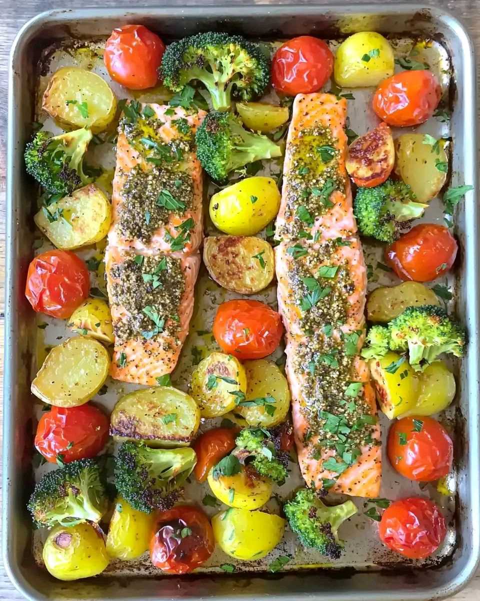 - A Mediterranean-inspired one-pan meal featuring flaky salmon fillets crusted with aromatic za’atar, paired with roasted cherry tomatoes, baby potatoes, and broccoli. Simple, wholesome, and loaded with bold flavor.