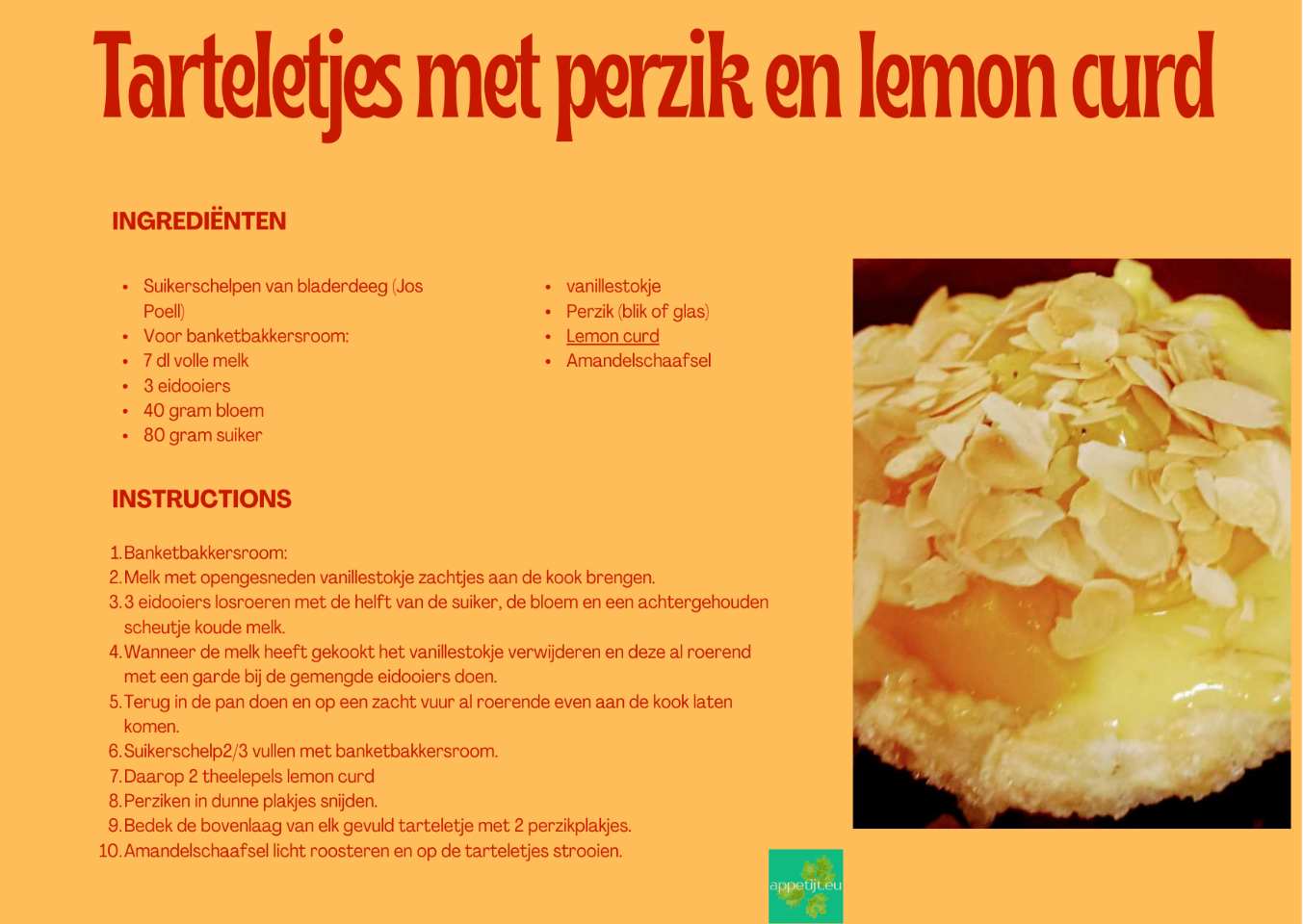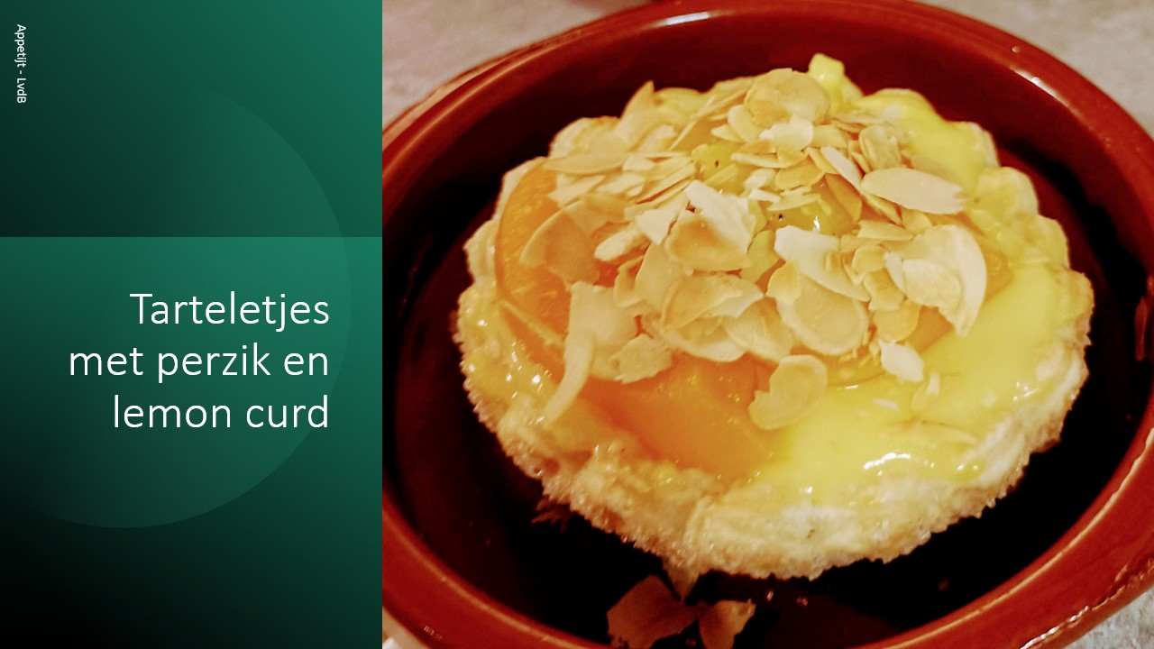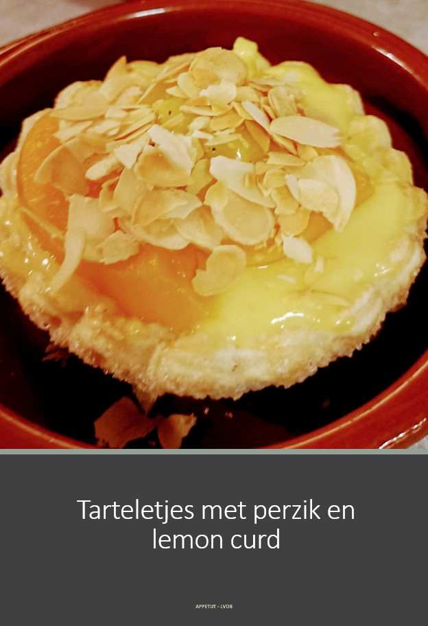- Bedek de bovenlaag van elk gevuld tarteletje met 2 perzikplakjes.