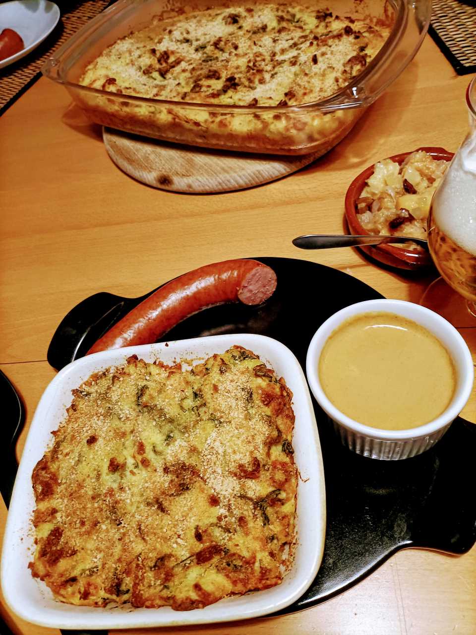 - Aardappelen, andijvie, eiermengsel, spekblokjes en geraspte kaas mengen. Het geheel moet niet te vast van structuur zijn, eerder aan de smeuïge kant.