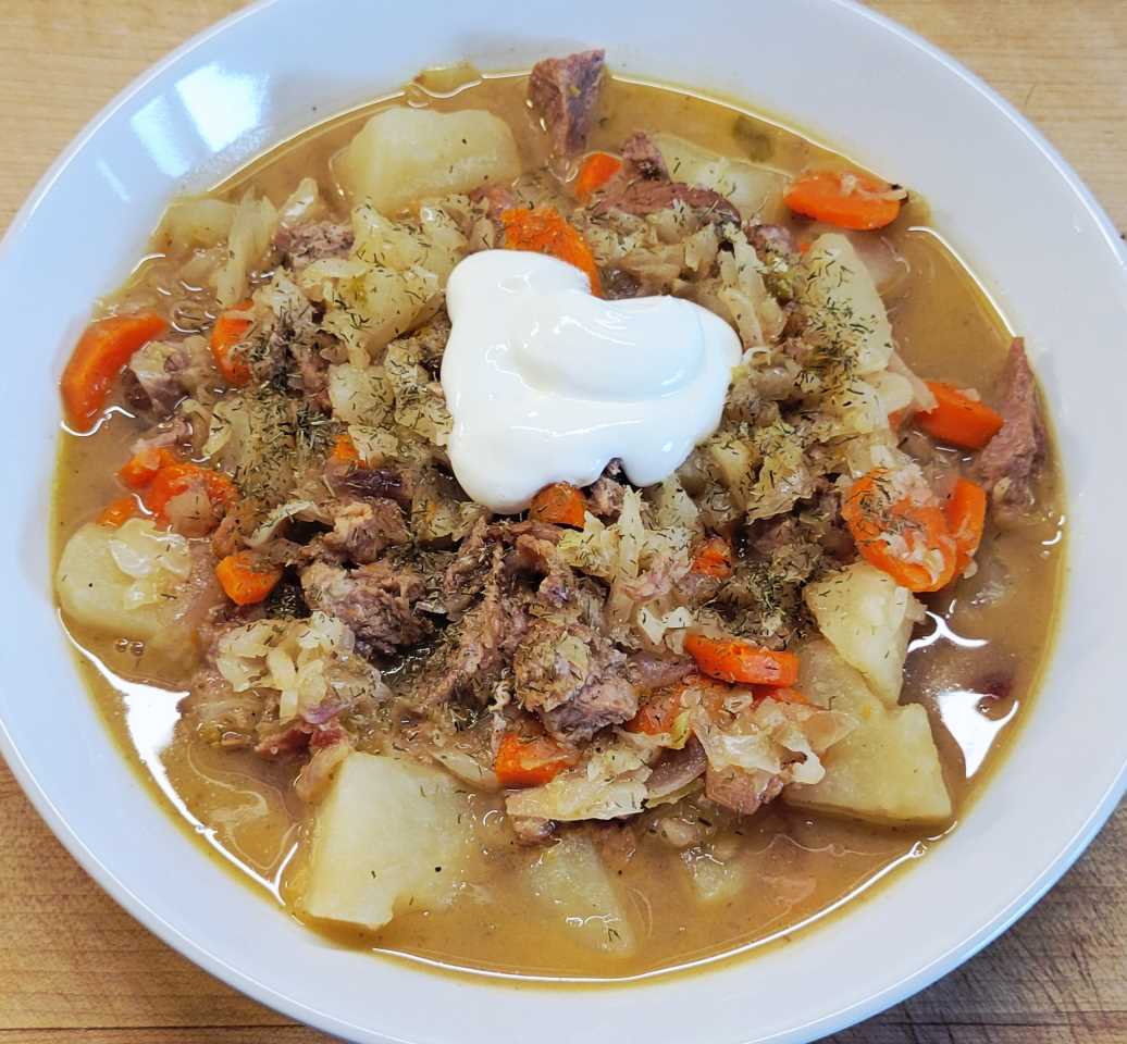 - Remove the pork ribs from the pot, place them on a plate, and set them aside. Add the sauteed veggies, potatoes, garlic, sauerkraut, salt, and pepper to the pot with the broth. Bring to a boil and then cook on low heat covered for 20 minutes or until potatoes are fork-tender.