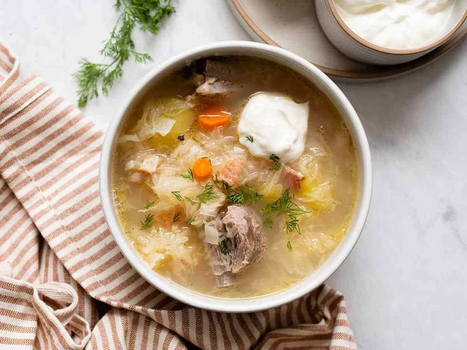 - Serve the soup hot with a dollop of sour cream and a slice of rye bread or baguette for dipping.
