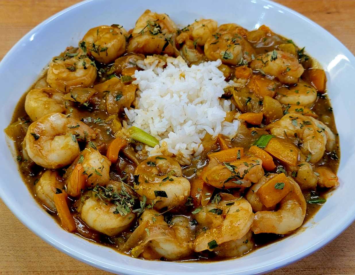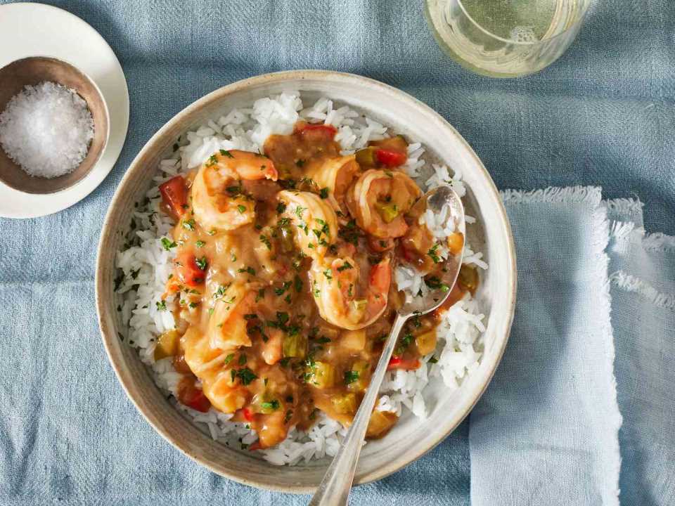 - Stir in bell peppers, and cook, stirring often, 5 minutes. Stir in broth and water, and cook, stirring constantly, until mixture thickens, 7 to 10 minutes. Stir in shrimp, and cook, stirring occasionally, until shrimp turn pink, about 5 minutes. Stir in hot sauce, salt, and pepper; cook 5 more minutes. Stir in scallions and parsley, and simmer 5 minutes. Remove from heat. Cover and let stand 5 minutes. Serve immediately over hot cooked rice.