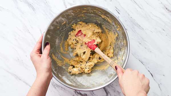 - 3. Fold flour, baking powder, and ¼ teaspoon salt into butter-sugar mixture until dough is just combined. Fold in chocolate chips and walnuts until evenly dispersed in the dough, being careful not to overmix.