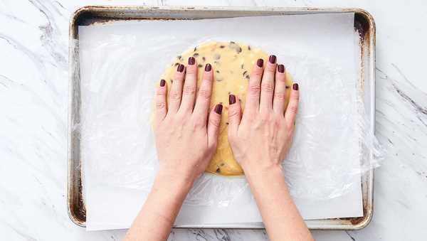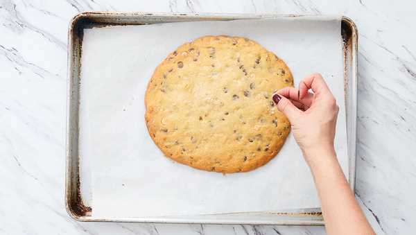 - 4. Scoop cookie dough onto prepared baking sheet. Arrange a large piece of plastic wrap over top of dough. Gently press and flatten dough into a disc, about ¼-inch thick. Then, remove plastic wrap from dough in a quick, fluid motion. Transfer baking sheet to oven and bake until edges are golden but center is still soft, 12-15 minutes.