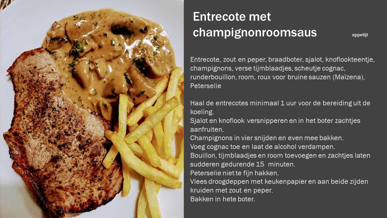 - Entrecote, zout en peper, braadboter, sjalot, knoflookteentje, champignons, verse tijmblaadjes, scheutje cognac, runderbouillon, room, roux voor bruine sauzen (Maïzena), Peterselie